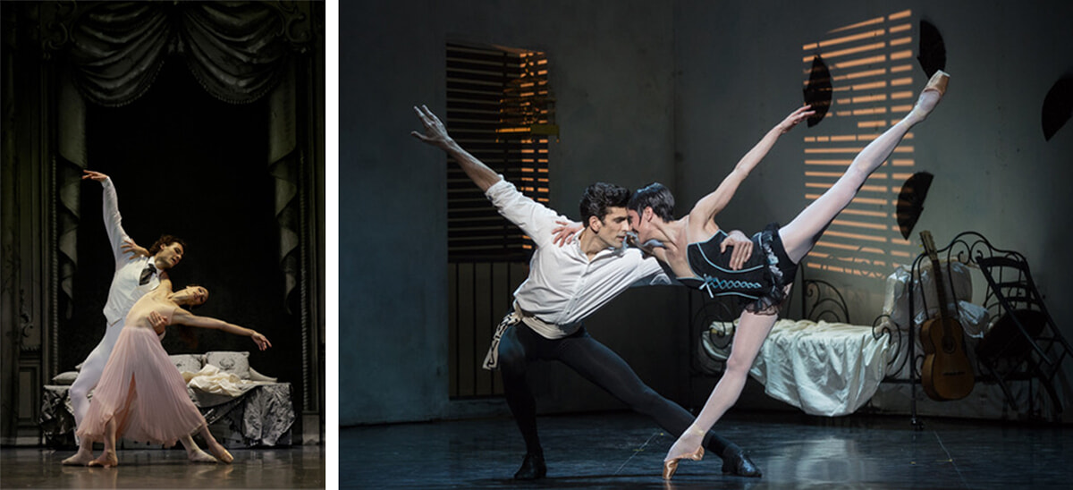 Aプロで踊られる『赤と黒』(左)と『カルメン』。オペラ座での公演より。photos: (左)Svetlana Loboff/Opéra national de Paris、(右)Ann Ray/Opéra national de Paris
