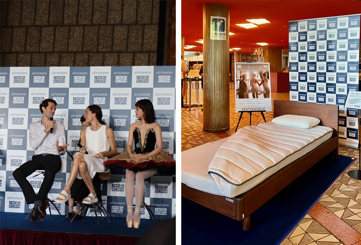 左: 記者会見のトークセッションより。左からマチュー・ガニオ、ドロテ・ジルベール、クララ・ムセーニュ。オペラ座のバレエ学校時代、ドロテもクララも通学生だったそうだ。右: 会場に展示されたバレエ学校に提供されるエアウィーヴのマットレス。photos: Mariko Omura