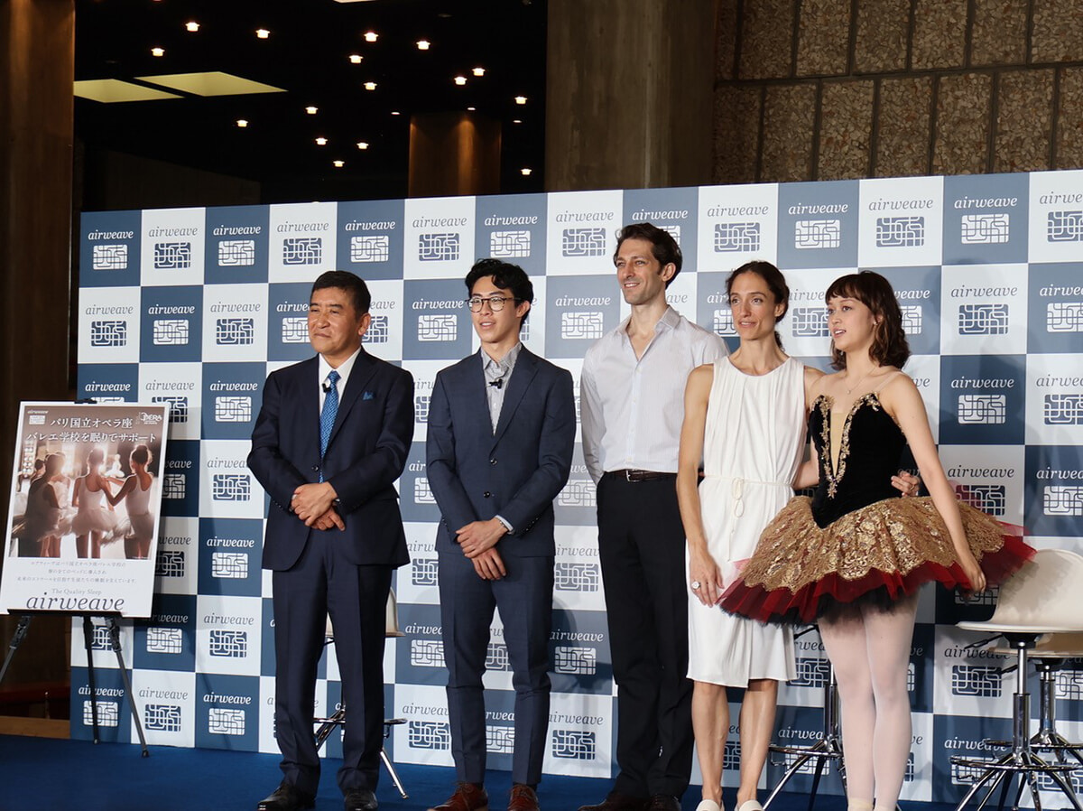 東京での公演初日となる31日の朝、エトワールのドロテ・ジルベールとマチュー・ガニオ、スジェのクララ・ムセーニュを迎え、プレスカンファレンスが行われた。「ル・グラン・ ガラ2023」を特別協賛するエアウィーヴが、パリ・オペラ座バレエ学校と公式スポンサー契約を結んだことの発表から記者発表会はスタート。高岡代表取締役会長兼社長によると、年末までにカスタマイズ可能な3分割のベッドマットレスを150台、バレエ学校のナンテールの寄宿舎に届けることになっているそうだ。未来のエトワールたちにクオリティの高い睡眠を! と、2013年にもエアウィーヴはマットレス100台を提供し、その際にはナンテールのバレエ学校内で初めてとなるCM撮影を行っている。カンファレンスにゲスト出演したスジェのクララ・ムセーニュは通学生だったのでその性能を知ることなく終わっているそうだが、現在カンパニーで踊っている若手の中にはエアウィーヴのマットで毎晩ぐっすり眠っていたダンサーたちもいるということだ。