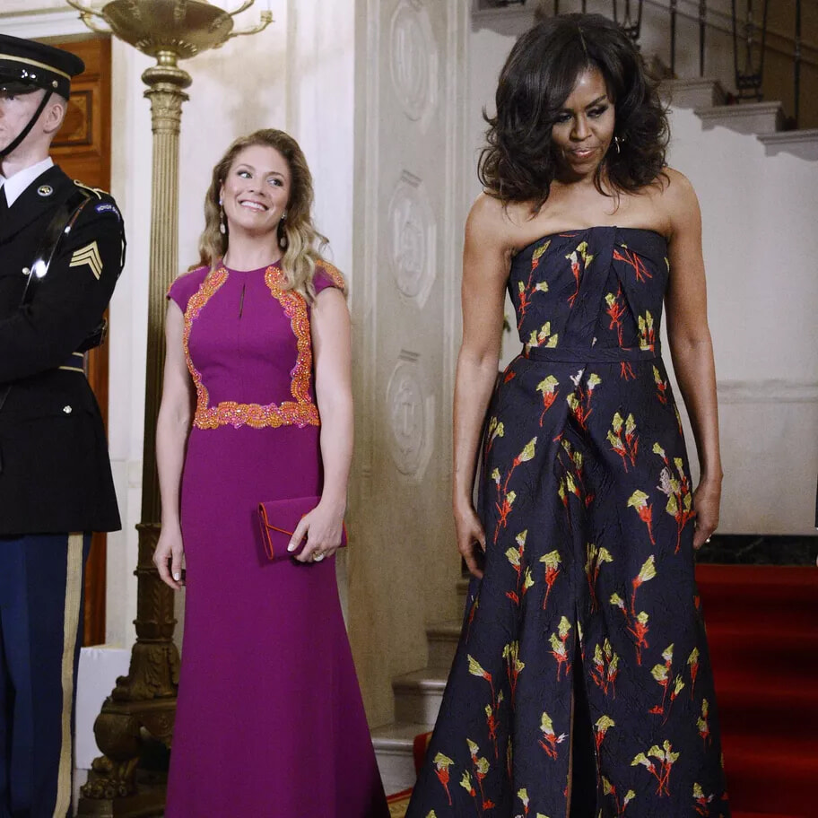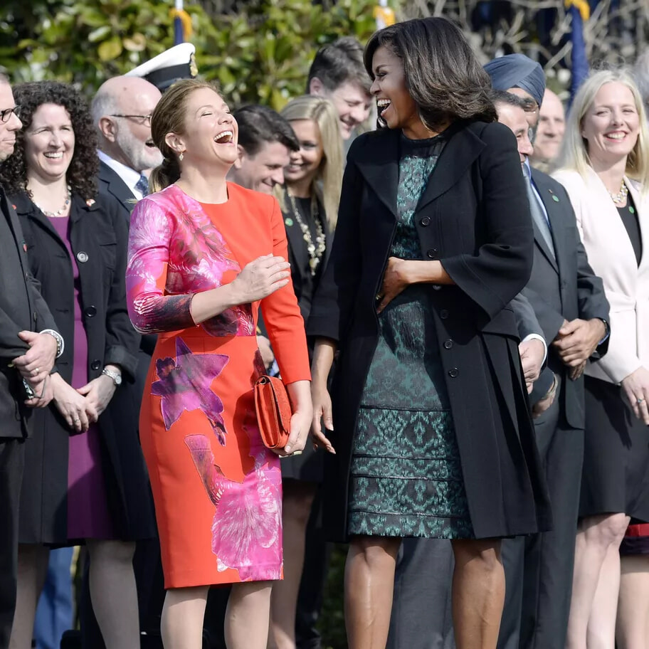 ソフィー・グレゴワール・トルドーとミシェル・オバマは、ドレスと笑い声で競いあう。(ワシントン、2016年3月10日)