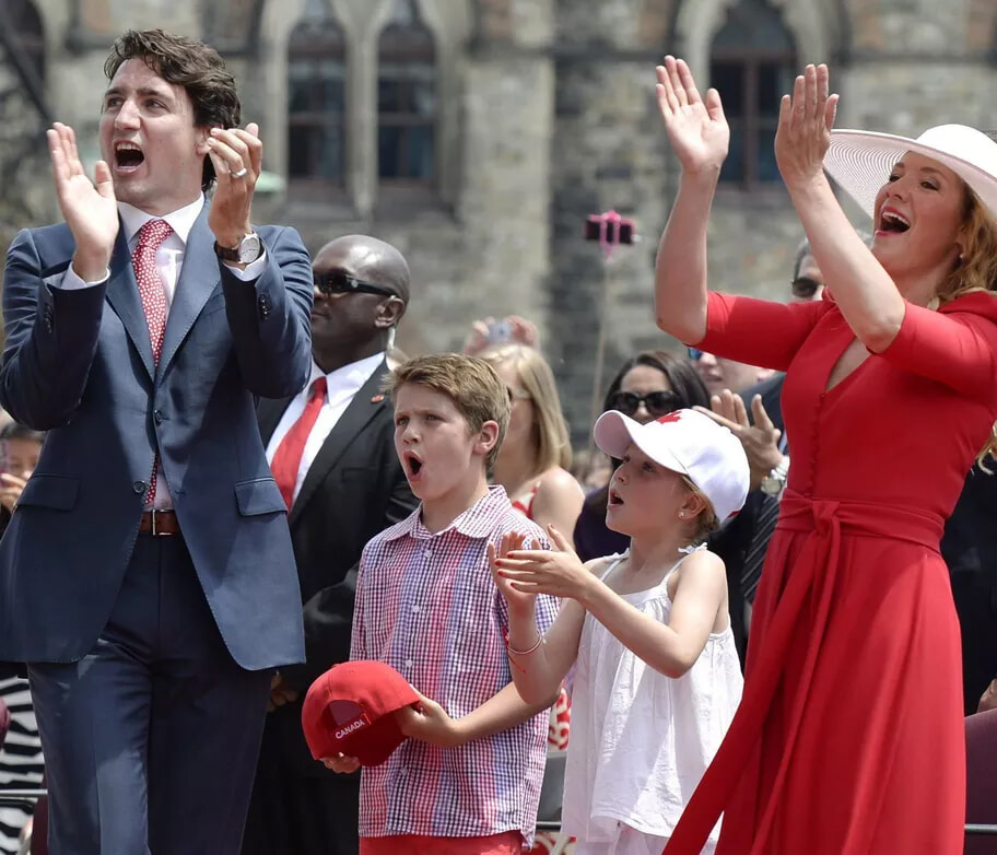 礼儀作法なんかより、まずは楽しもう主義のトルドー家。(オタワ、2016年7月1日)
