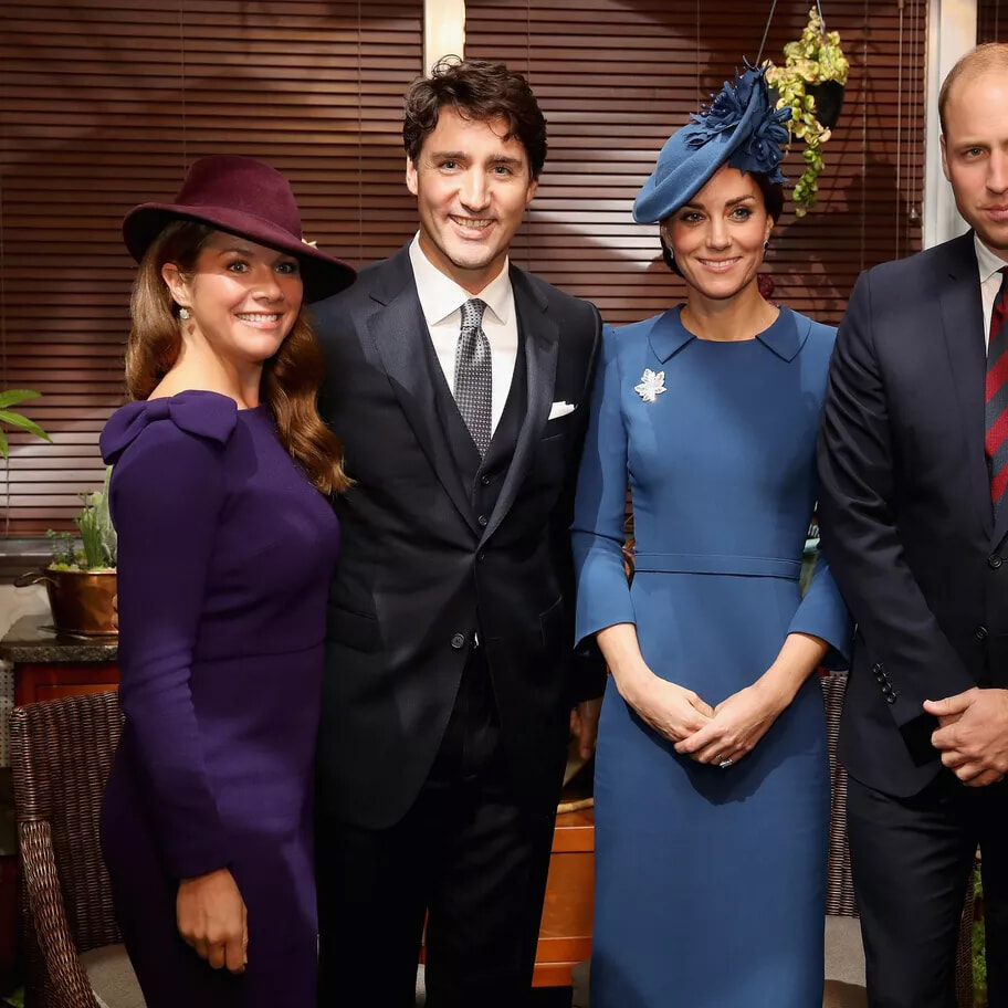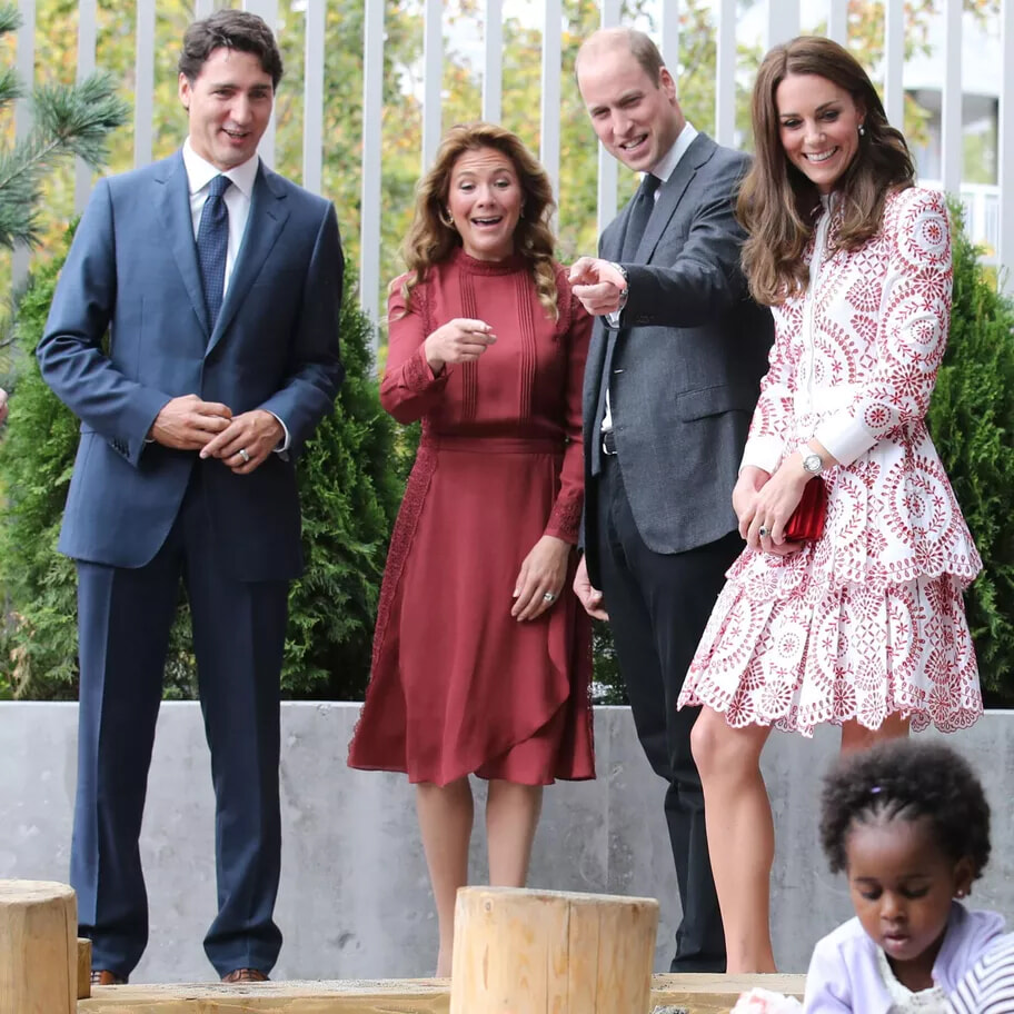 ウィリアム皇太子とキャアサリン皇太子妃を迎えるジャスティン・トルドーとソフィー・グレゴワール。みんなでおすまし顔。(バンクーバー、2016年9月25日)