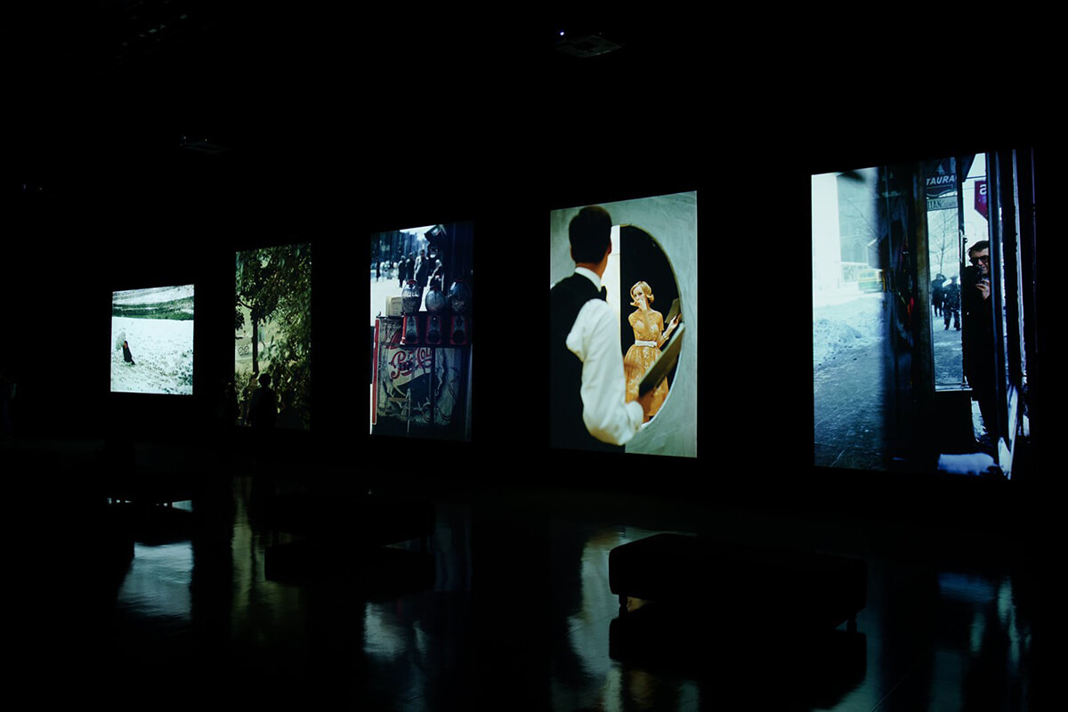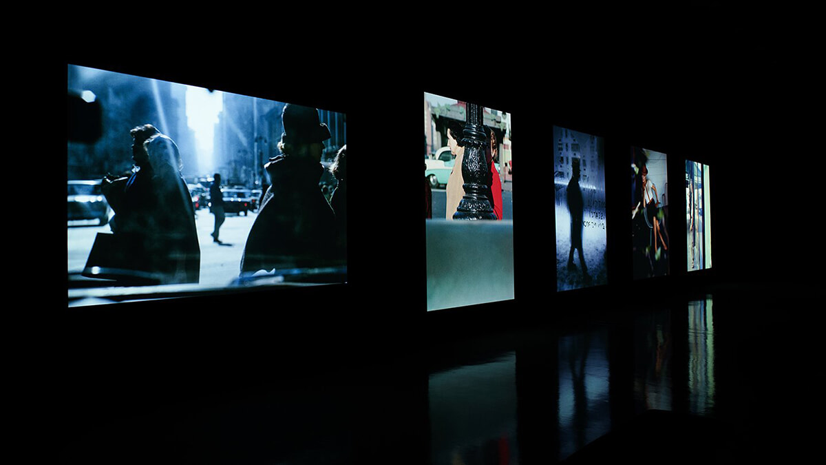 『ソール・ライターの原点 ニューヨークの色』展示風景より 現時点で整理された約11,000点のソール・ライターによるカラーポジから、未発表作品も含むおよそ250点を厳選し、10面の大型スクリーンにプロジェクションした空間ではイメージへの没入感が生まれる。