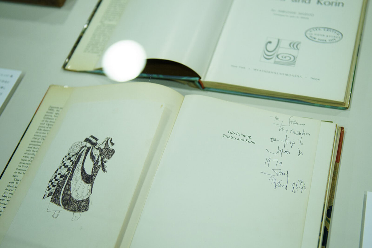 『ソール・ライター日本関係蔵書展』展示風景より ソール・ライターは俵屋宗達や鈴木春信が好きだったようで、何冊もの本が展示されていた。この本には「ソームズと日本を旅した思い出に。1974年」といった内容のメモが自筆で残されているが、実際にその年に来日してはおらず、架空の思い出をパートナーと共有したファンタジックな一面が垣間見られる。