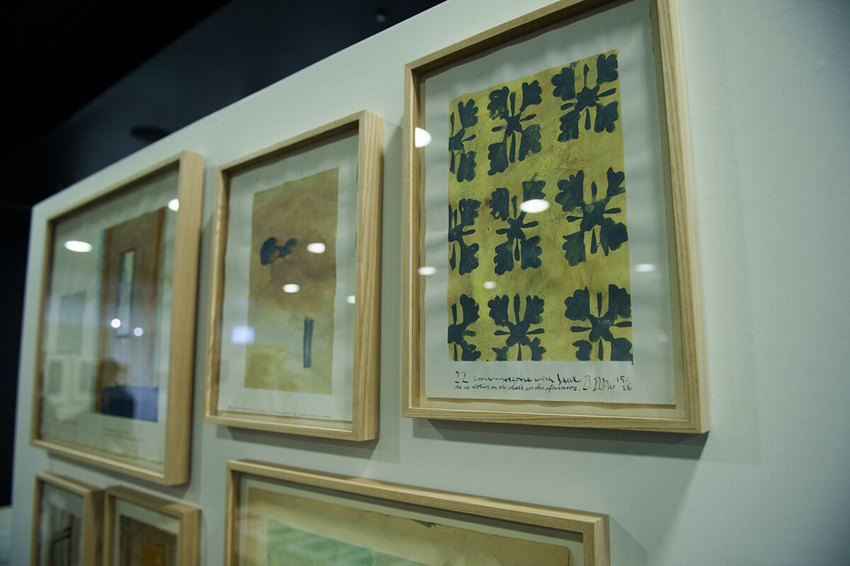 『ソール・ライター日本関係蔵書展』展示風景より 平松麻がソール・ライターのアパートで描いた「Conversation with Saul」と題するシリーズを展示。森岡が平松の作品にライターの画風と共通するテイストと世界観を感じたことで、ライターをテーマに制作を依頼した。