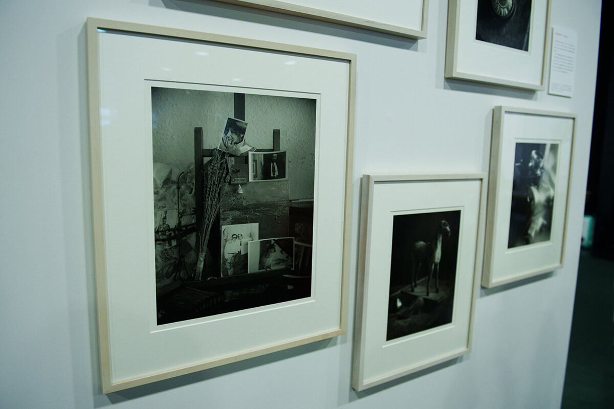 『ソール・ライター日本関係蔵書展』展示風景より 写真家の井津由美子がソール・ライターのアトリエを訪れて撮影した作品も展示。画面左の作品に写されているのは、ソール・ライターの父親やパートナーのソームズ、ペインティングなどを設置し、布をかけて大切に管理していたライターにとっての神棚のようなイーゼルだ。
