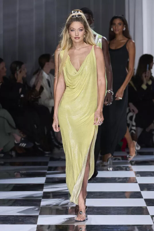 ヴェルサーチェ2024年春夏コレクションに登場した、レオナルド・ディカプリオの元カノのジジ・ハディッド。(ミラノ、2023年9月22日)photography: Imaxtree