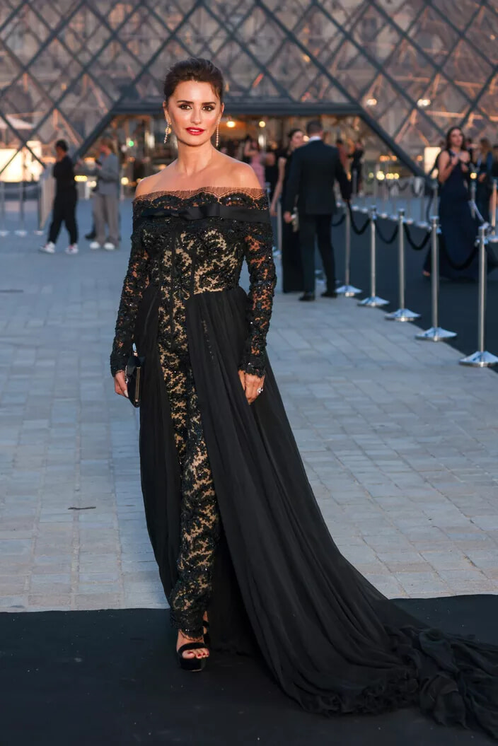 化粧品ブランド「ランコム」のコラボレーションイベントのために、セレブリティたちは象徴的なルーブル美術館の前でポーズをとった。パリ・ファッションウィークと同時に開催されたこの夜は、ファッションショーのフロントローに引けを取らないほど素晴らしく、ペネロぺ・クルスがそれを証明した。女優のペネロペ・クルスは、ジャンバティスタ・ヴァリの最新オートクチュール・コレクションから、肩を出した黒いレースドレスを披露した。レースに縫い付けられたスパンコールに照らされたペネロぺ・クルスは、ウエストから始まる長いトレーンも特徴的だった。アクセサリーに関して、非常に高いヒールのサンダルと光沢のあるレザーのミニクラッチバッグを合わせた。イエローゴールドにダイヤモンドがあしらわれたヴィルティエのピアスで、モノクロームのルックがさらに輝きを増した。