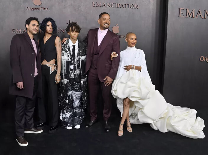 スミス一家:(左から右へ)トレイ(30歳)、ウィロー(22歳)、ジェイデン(24歳)、ウィル(54歳)、ジェイダ(51歳)、はロサンゼルスでの『自由への道』のプレミアイベントでポーズをとった。(ロサンゼルス、2022年11月30日)photography: Abaca