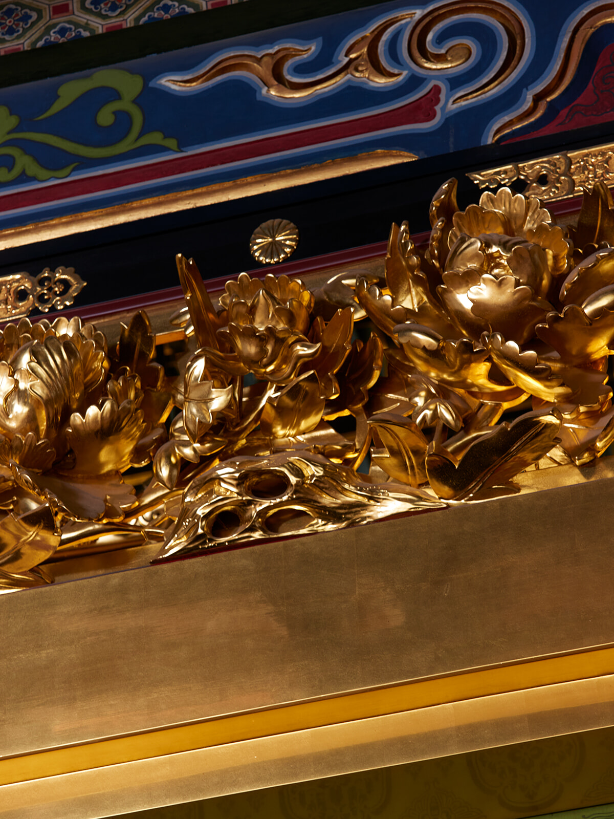 細かく彫られた欄間の装飾部分にも金箔が隙間なく貼られている。