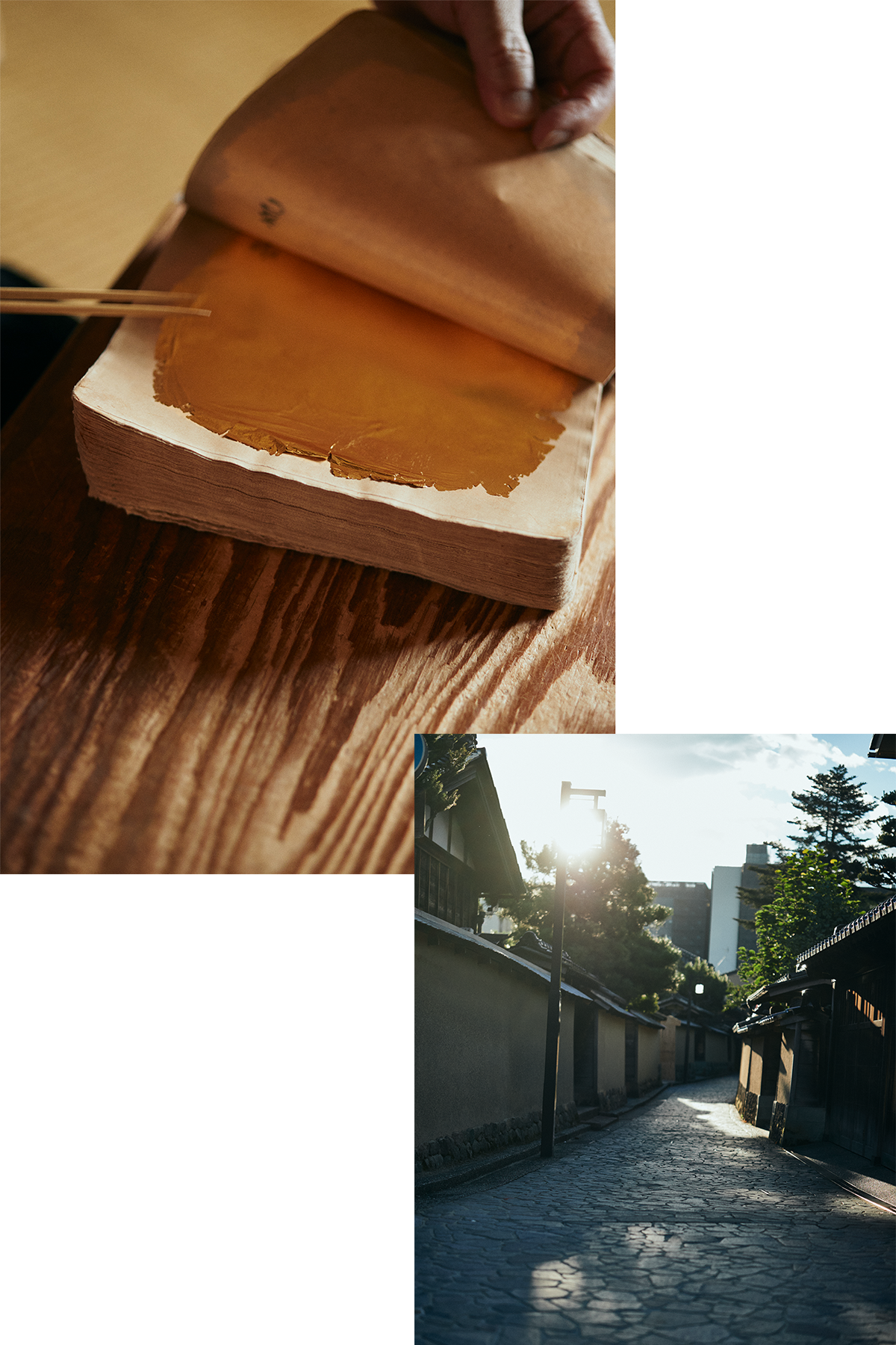 (上)打ち上がった金箔を一枚ずつ竹箸で移し替える。わずかな風や静電気でも崩れてしまうため、集中力を要する作業だ。(下)武家屋敷が残る金沢の街並み。箔打ちは、前田利家をはじめ、歴代の加賀藩主らの文化奨励策によって受け継がれてきた。