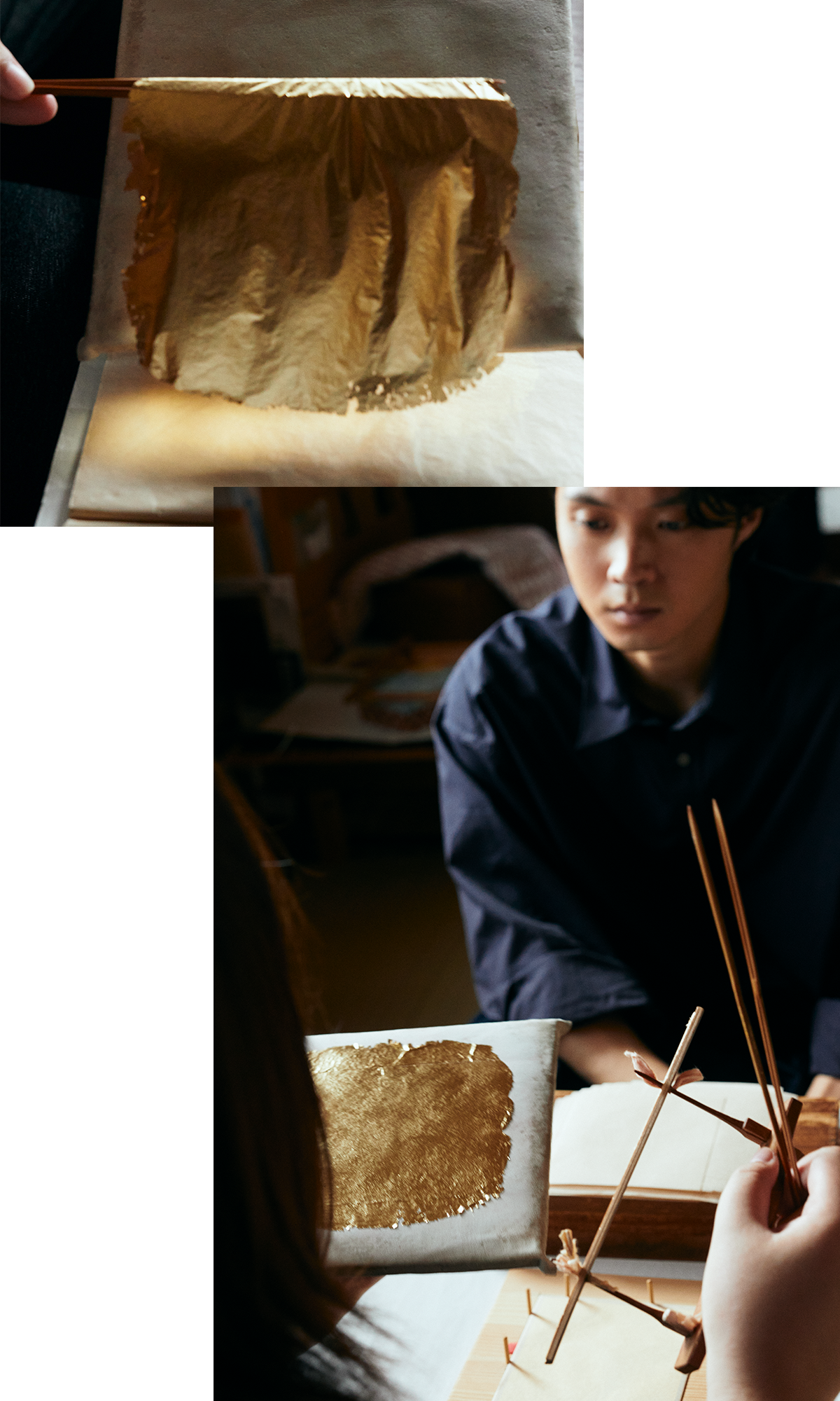 この工房で昨年から研修を始めた桶谷未緒に、縁付金箔の最終工程を見せてもらった。「学生時代は日本画をやっていたので、箔は身近な存在でした。ものづくりに関わる仕事をしたいと思い、今回の研修生制度に応募しました」と話す桶谷は、昔ながらの竹の道具を使って器用に金箔を切り揃え、和紙に移し替えていく。