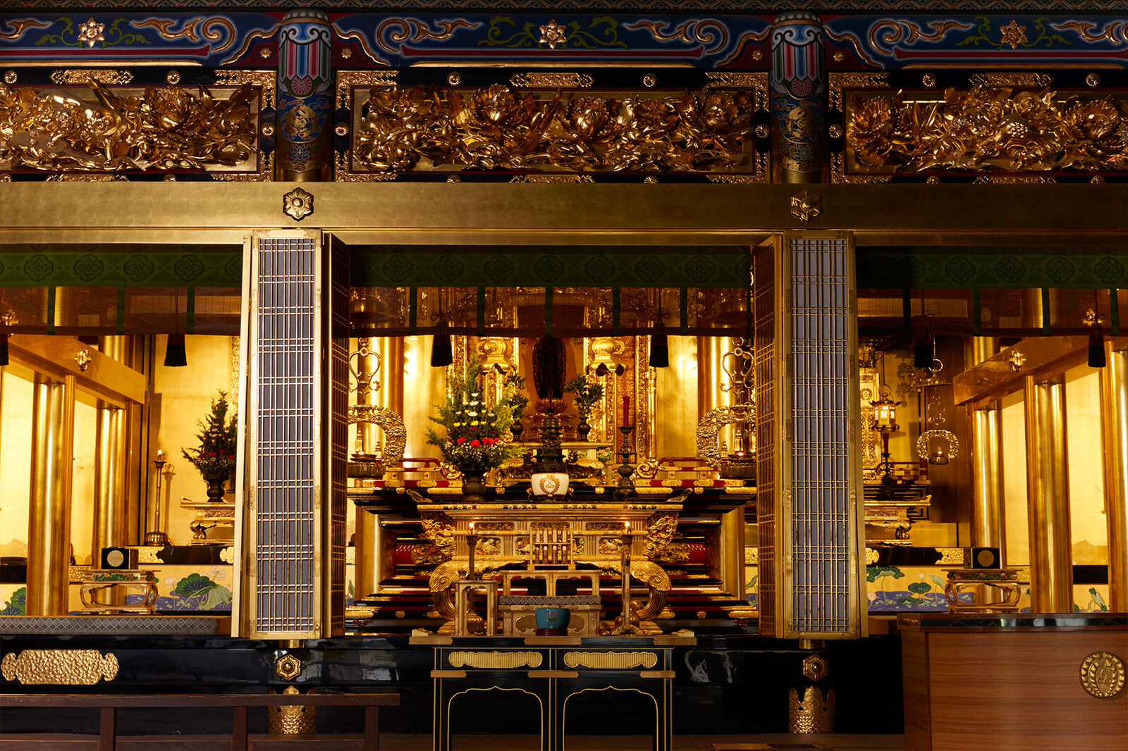 本願寺金沢別院は、浄土真宗本願寺派(西本願寺)の別院。壁や柱、細やかな装飾にいたるまで金箔が施され、薄暗い本堂で輝きを発している。「金色(こんじき)」という言葉には「価値あるもの」「不変であること」というふたつの意味がある。