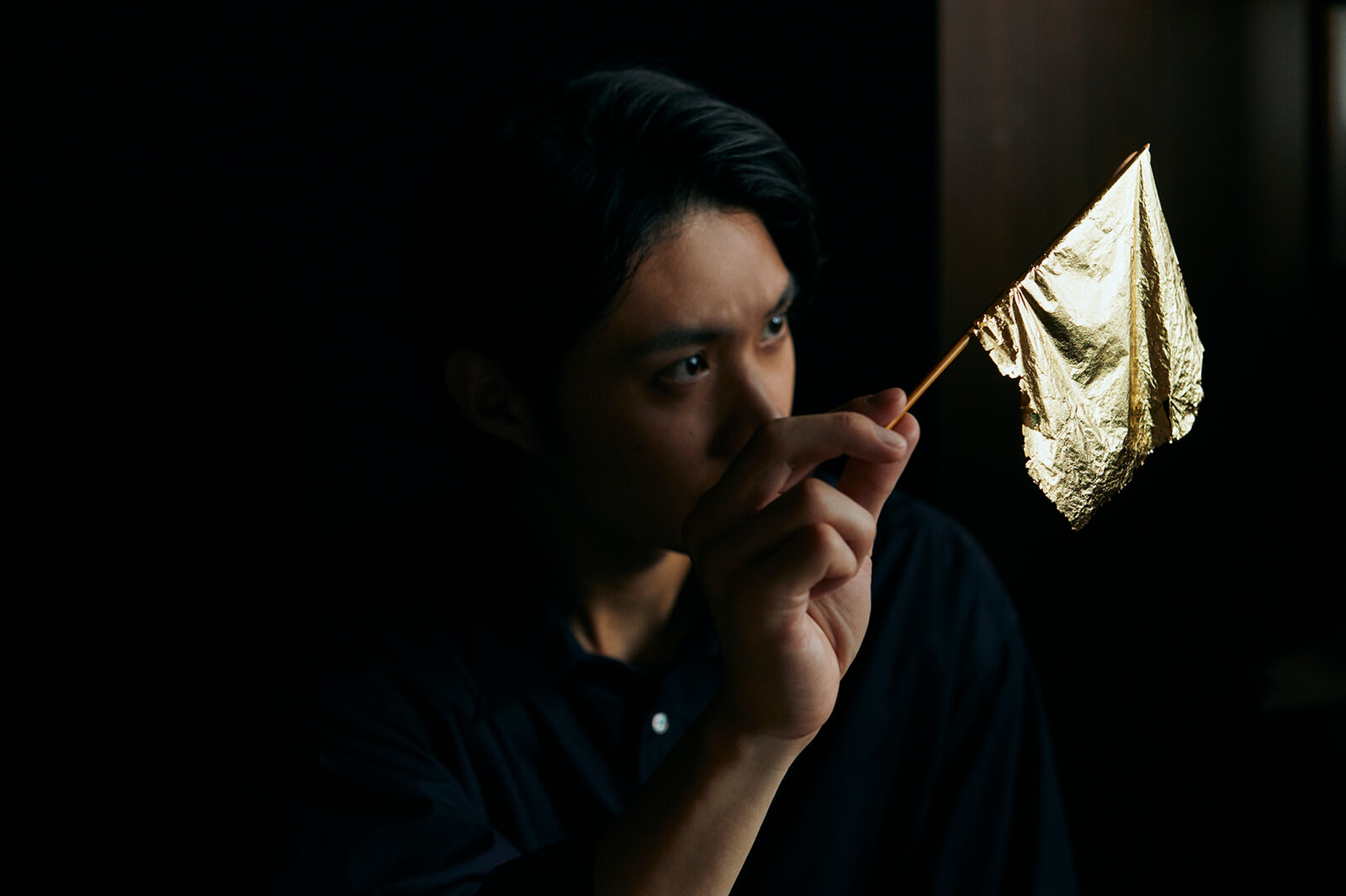 打ち上がった金箔を竹箸に取り、光に透かして真剣に眺めている磯村。「透けるほど薄いのに艶があって、独特の輝きがありますね」