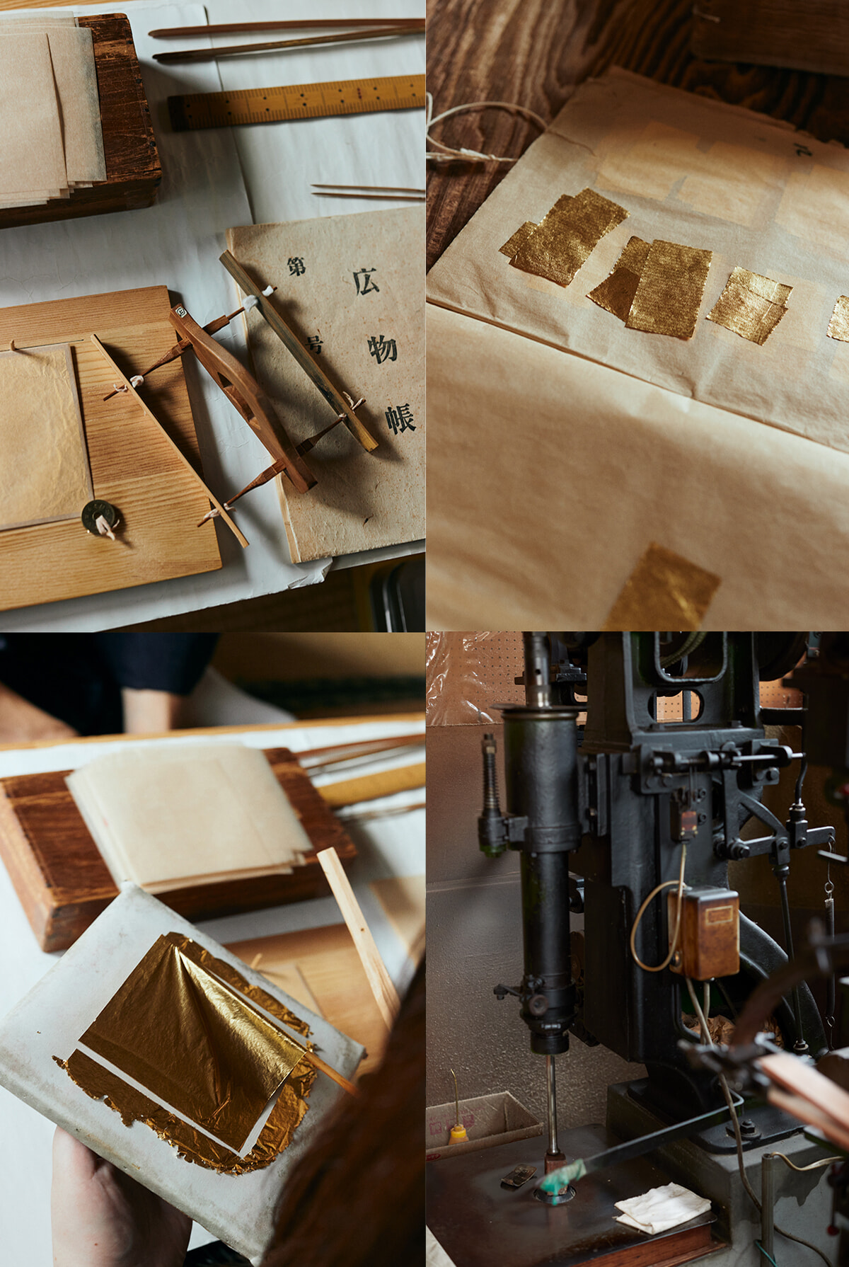 (右上)箔打ち前の20cm四方の金片は「上澄(うわずみ)」と呼ばれ、厚さはおよそ1,000 分の1mm。厚さが不均一なため、職人の目利きにより9~12片に切り分けてから箔打ちを始める。 (右下)工房に並ぶ箔打ち機。箔打紙の束を手で固定しながら、さらに一万分の1mmの厚さまで延ばしていく。昔は2人1組になって金槌で休みなく叩いていた。  (左上)竹製の枠を使って10.9cm角に切り揃える。 (左下)周囲の余分な箔は軽く息を吹きかけて落とす。落とされた金箔は食用や化粧品などに、使用済みの打紙は油取り紙にと余すところなく利用されている。