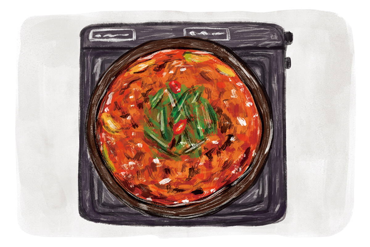 トゥルチギは豚肉と野菜をコチュジャンなどで炒めたもの。豚肉以外の食材(牛肉、魚介類、豆腐)でも作れるが、「豆腐トゥルチギ」などと書かれてない限り、豚肉が一般的。トゥルチギと同じく豚肉を使うチェユクポックンとの区別は難しく韓国人の間でも論争が起きるほど。両方とも安い食材でもおいしく作れるので、大衆食堂や居酒屋での定番メニューだ。少し甘味のある韓国焼酎には、この辛さがピッタリ。『椿の花の咲く頃』では、主人公ドンベクの店、カメリアの看板料理。地元の女性たちはカメリアに男たちが集うのを嫉妬して、新参者のドンベクに意地悪するが、地元の味に慣れすぎてしまった男たちには、ドンベクの作るエゴマの葉がのった見た目も美しいトゥルチギが新鮮に映るようだ。田舎町での人間関係を、トゥルチギが取り持ってくれたのだ。