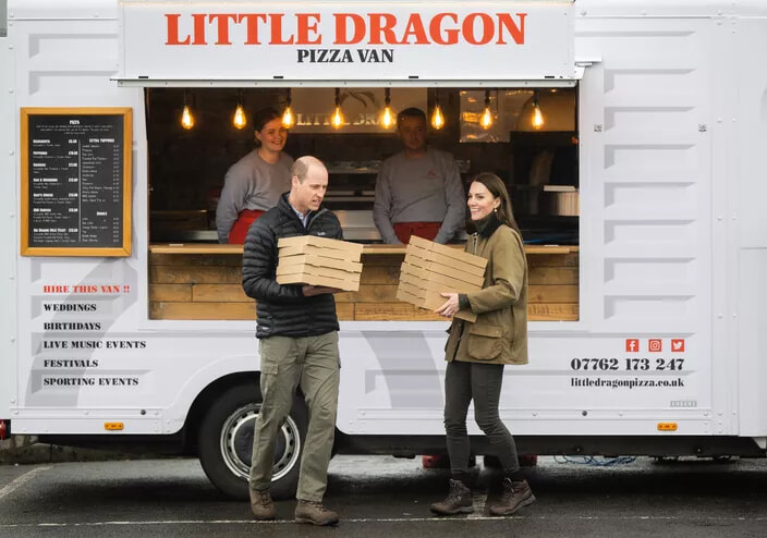 1日ピザを配達するウィリアム皇太子とキャサリン皇太子妃。(2023年4月27日)
