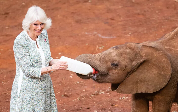 カミラ王妃は女王として、子ゾウに哺乳瓶でミルクを与えるなど、多くの責任を負うことになった。(ナイロビ、2023年11月1日)