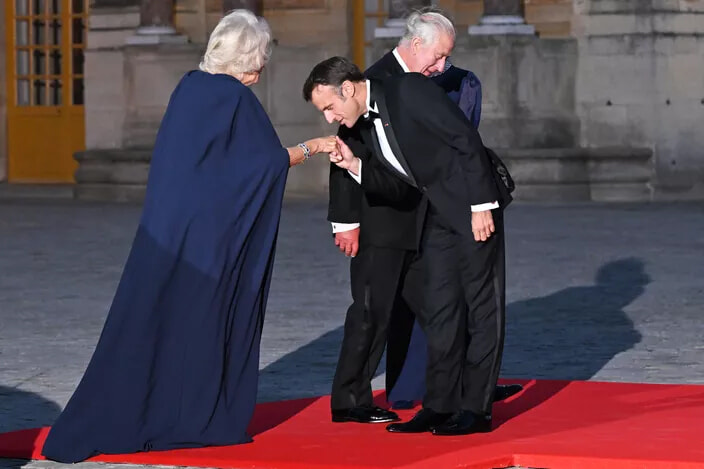 ヴェルサイユ宮殿に到着した仏大統領エマニュエル・マクロンからカミラ王妃への表敬キス。(2023年9月20日)