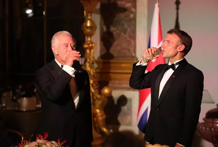 本拠地ヴェルサイユでのシャンパングラス。(チャールズ3世とヴェルサイユ宮殿での国賓晩餐会を開く仏大統領エマニュエル・マクロン、2023年9月20日)