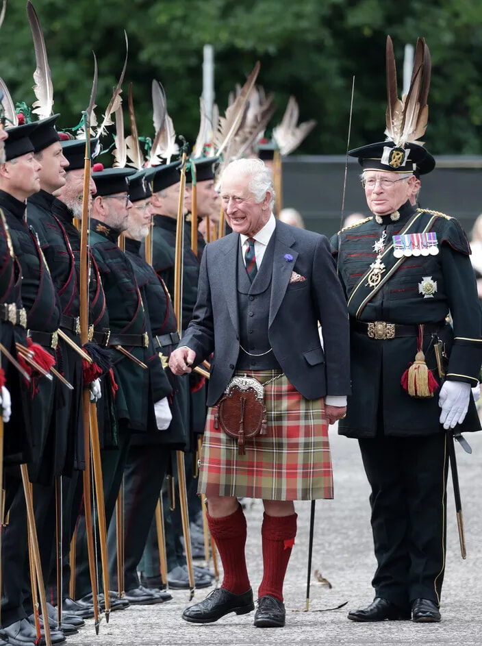 スコットランド王チャールズ3世のキルトとハイソックス。(エディンバラ、2023年7月3日)