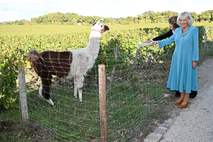 カミラ王妃とラマ、ボルドー地方のブドウ畑での偶然の出会い。(2023年9月22日)