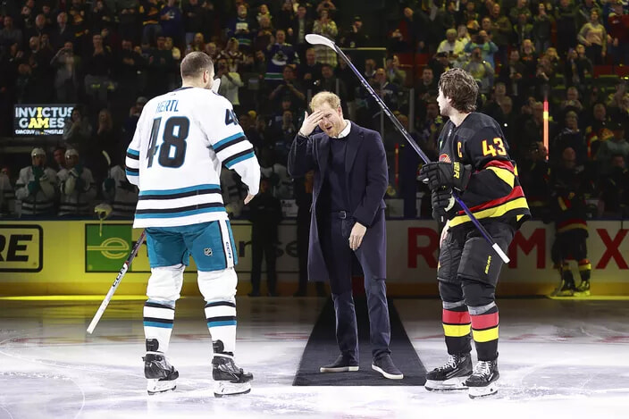 サンノゼ・シャークスのバンクーバー・カナックス戦でのハリー王子。(バンクーバー、2023年11月20日)
