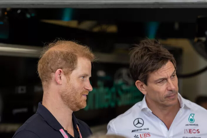 元レーシングドライバーのトト・ヴォルフとパドックにいるハリー王子。(オースティン、2023年10月22日)