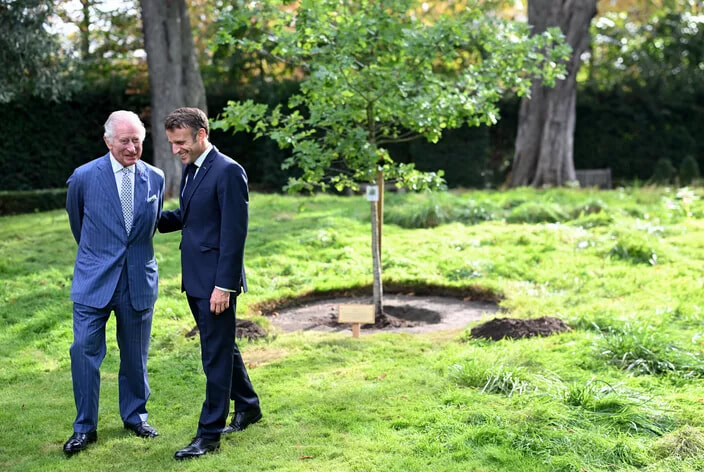 在フランス英国大使館の庭園にて、チャールズ3世と仏大統領の微笑みと抱擁。(パリ、2023年9月20日)