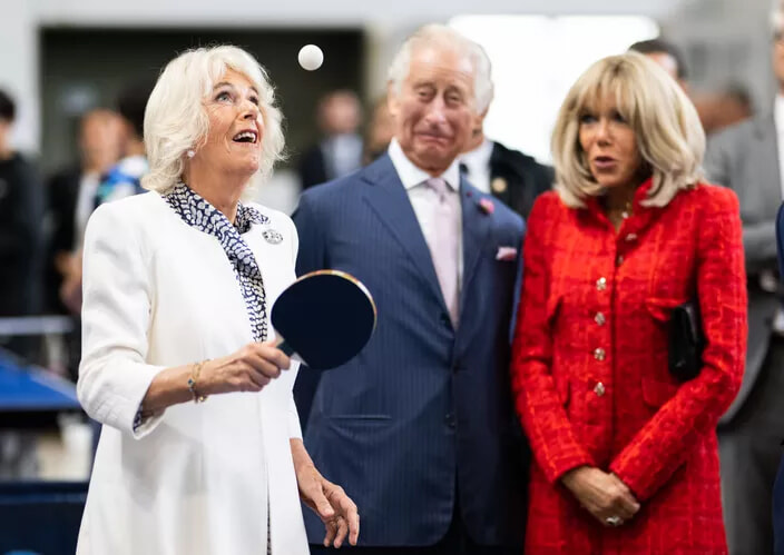 夫チャールズ3世とブリジット・マクロン夫人が興味深く見つめる中、カミラ王妃は卓球の技を披露。(パリ、2023年9月21日)