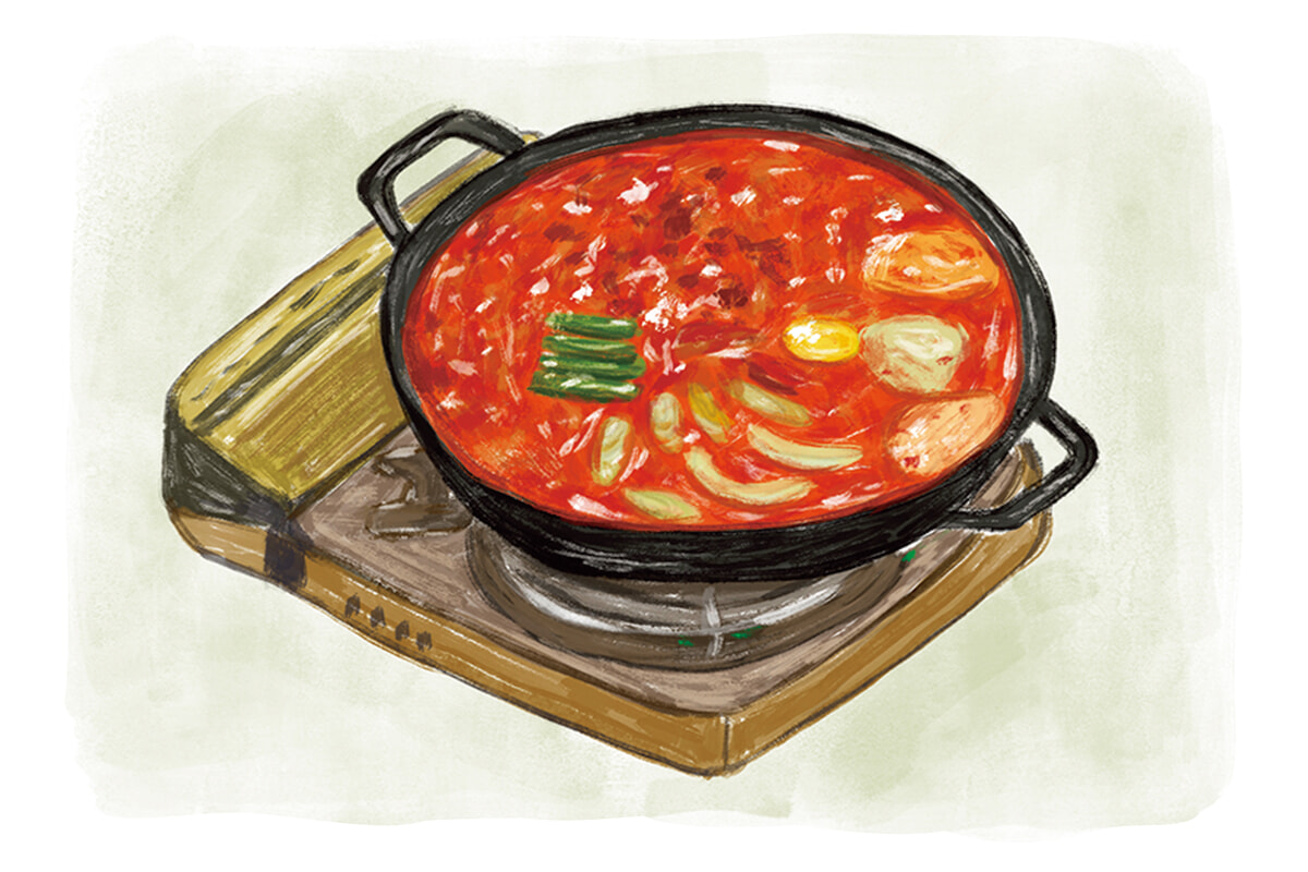 スンドゥブは漢字で純豆腐。おぼろ豆腐に似た柔らかい豆腐を、魚介類などと一緒に煮込んでピリ辛チゲに仕立てる。平凡な定食だったのが、移民した韓国人がアメリカでチェーン展開し、大ブームに。2000年頃には韓国に逆輸入され、全国にスンドゥブ専門店プクチャンドンスンドゥブができた。若い頃の恨みを胸にスンドゥブを商売道具として敵を討つサクセスストーリー『梨泰院クラス』では、毎回ドラマにスンドゥブが頻出。最終回では父から受け継いだ秘伝のメジュ(味噌玉麹)も登場する。田舎の大衆食堂から大都会のフードコートまで、どこでも見かけるスンドゥブチゲ。ドラマのヒットをきっかけに、主人公を演じたパク・ソジュンは今年、ハリウッド進出。スンドゥブ同様、アメリカでもパク・ソジュンの存在が知れわたる日はそう遠くはない。