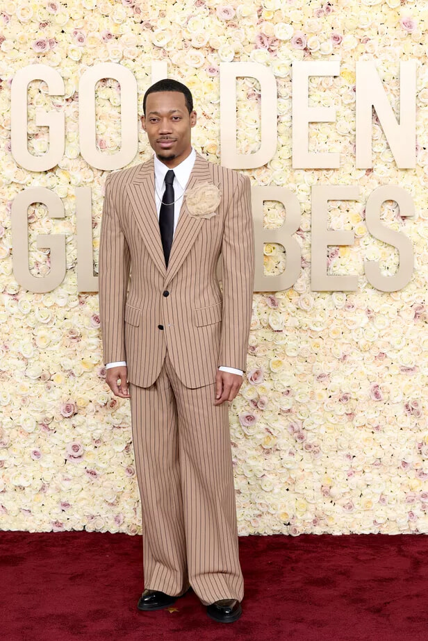 81回ゴールデン・グローブ賞授賞式にドルチェ&ガッバーナを身に纏って登場したタイラー・ジェームズ・ウィリアムズ。(ロサンゼルス、202417日)