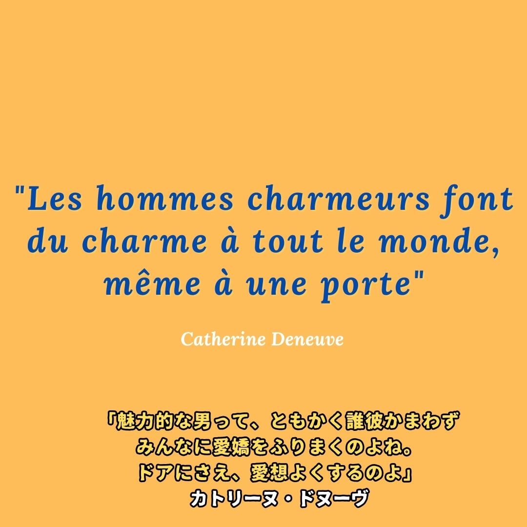 そんな男性と話をしていても、その視線は別の方向に泳いでいるし、次の獲物を狙っているみたい。どうしてそんなに多くの人に気に入られたいのかわからないけれど、ひとりでも多くの人に自分の魅力をわかってもらいたい欲求が半端ない。ドヌーヴの言葉は思いつきではなく、じっくり考えたような言葉なので、なるほど、と思うものが多いし、これにはなぜかはまってしまう。