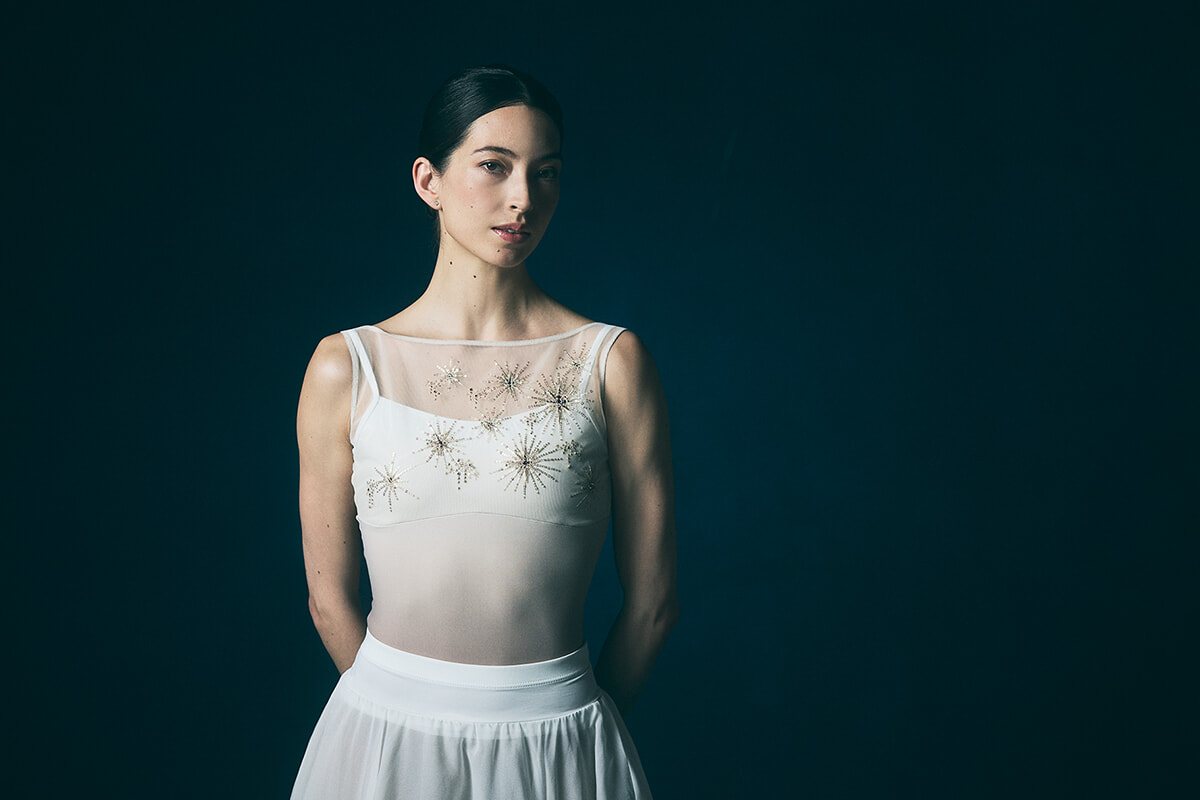「ダンスウエアは機能だけでなく、色も形も着ていて自分が綺麗だと感じられることが必要です。それに、たとえばチュチュで踊る作品の稽古では袖のある稽古着は着ないように、ロマンティックな作品の時は襟ぐりが大きく開いた稽古着をというように、役に合わせてウエアを選ぶことをいつも意識していて……稽古の時から役になりきれるように自分なりに工夫してるんです。このコレクションで特に私がこだわったのは形、色、着心地。東京での撮影の時に完成品を着てみて、”ああ、とてもいい気持ち!!”って。チャコットのみんなが私の希望をしっかりと叶えてくれて、思ったとおりに出来上がったと感じられました」