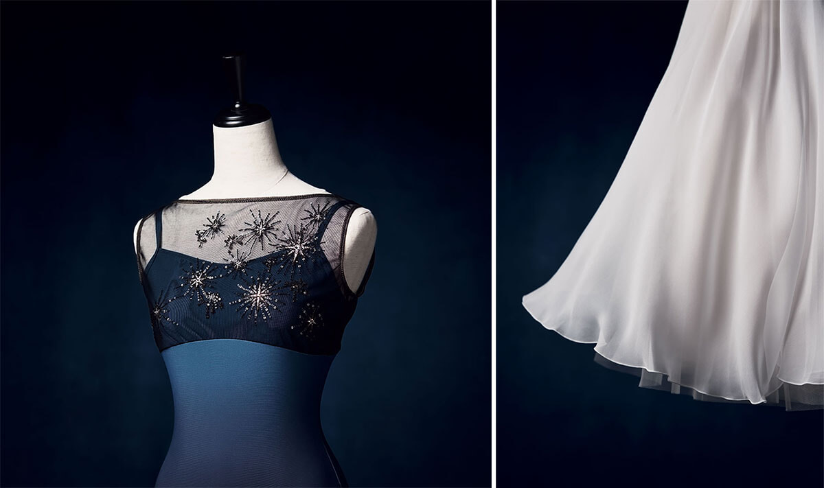 左: 上のレオタードのカラー違い。身頃の生地は立体裁断で、一枚ずつ丁寧に仕立てられている。各色50枚限定のシリアルナンバー入り。 右: スカートにはパリ・オペラ座の衣装にも使われるシルクジョーゼットが使われ、裾まで軽やかで余韻のあるエレガントな動きを生む。