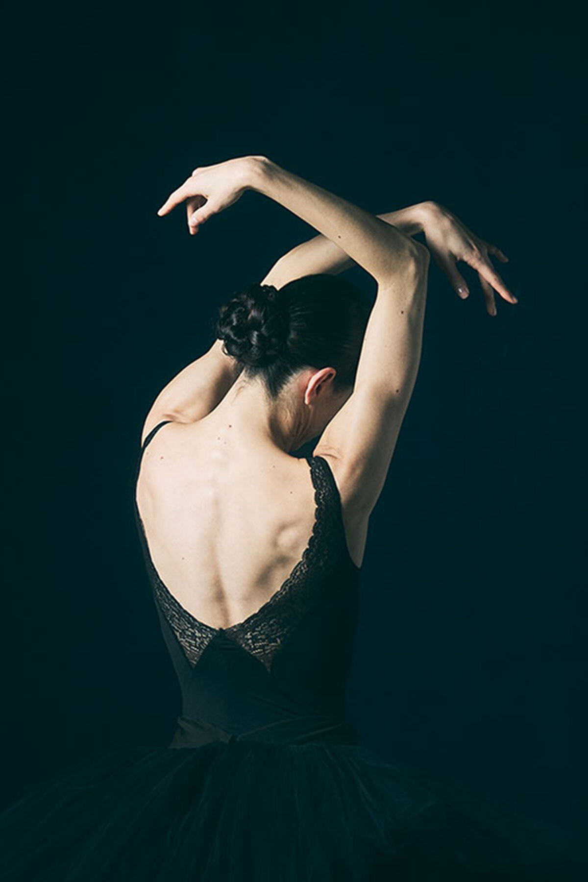 『白鳥の湖』のリハーサルでは、腕の動きを妨げないスリーブレスタイプのレオタードを選ぶという八菜さん。今回のアイテムは、光沢感のあるヴィンテージライクな素材を用い、繊細なストレッチレースと組み合わせてデザインされた。ノースリーブレオタード ブラック ¥15,400(2/2発売)/チャコット