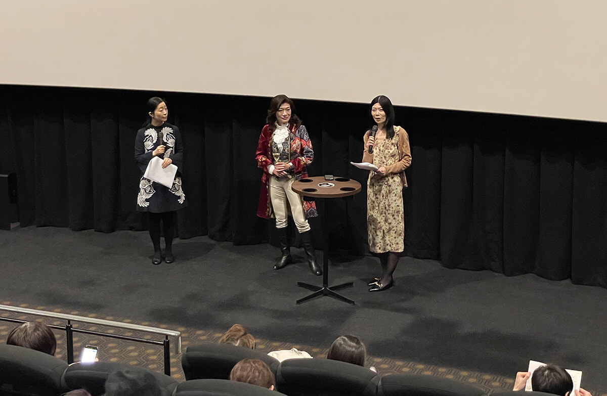 観客はドリンクを持ったまま劇場内へ。上映を前に、シャンパーニュや劇中で描かれるフランス文化の理解度を深めてくれるトークショーが始まった。登壇者はルイ・ロデレールを輸入販売するエノテカ株式会社で広報を担当する佐野昭子さんと、服飾史家、著述家の中野香織さんだ。
