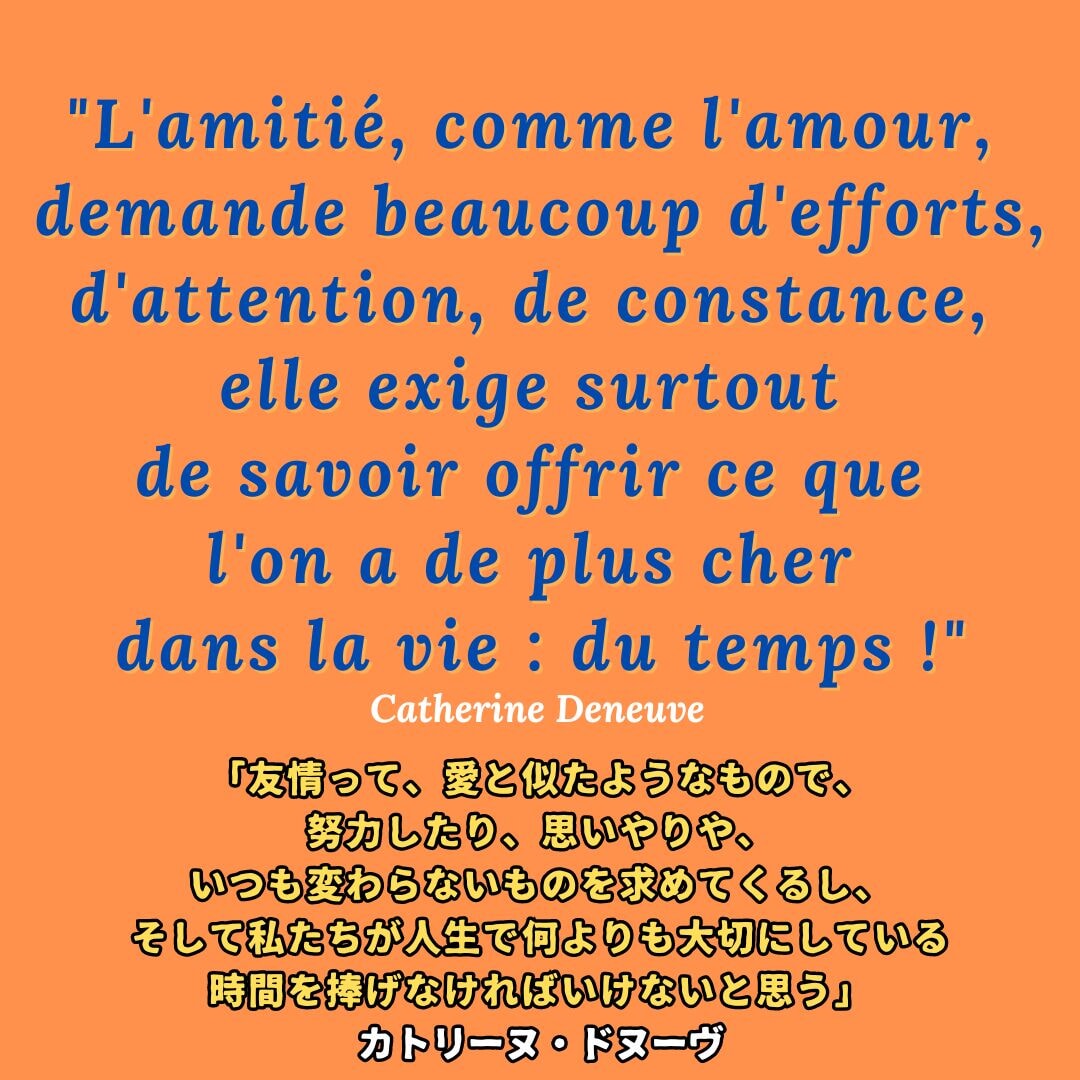 ドヌーヴのこの言葉の中では、時間と友情のところは、少し疑問が残る。彼女のように多忙な人なら、時間はもっとも大切な宝物なのかもしれないが、一般的にはどうだろうか。もっと大切なものがあるような気がする。