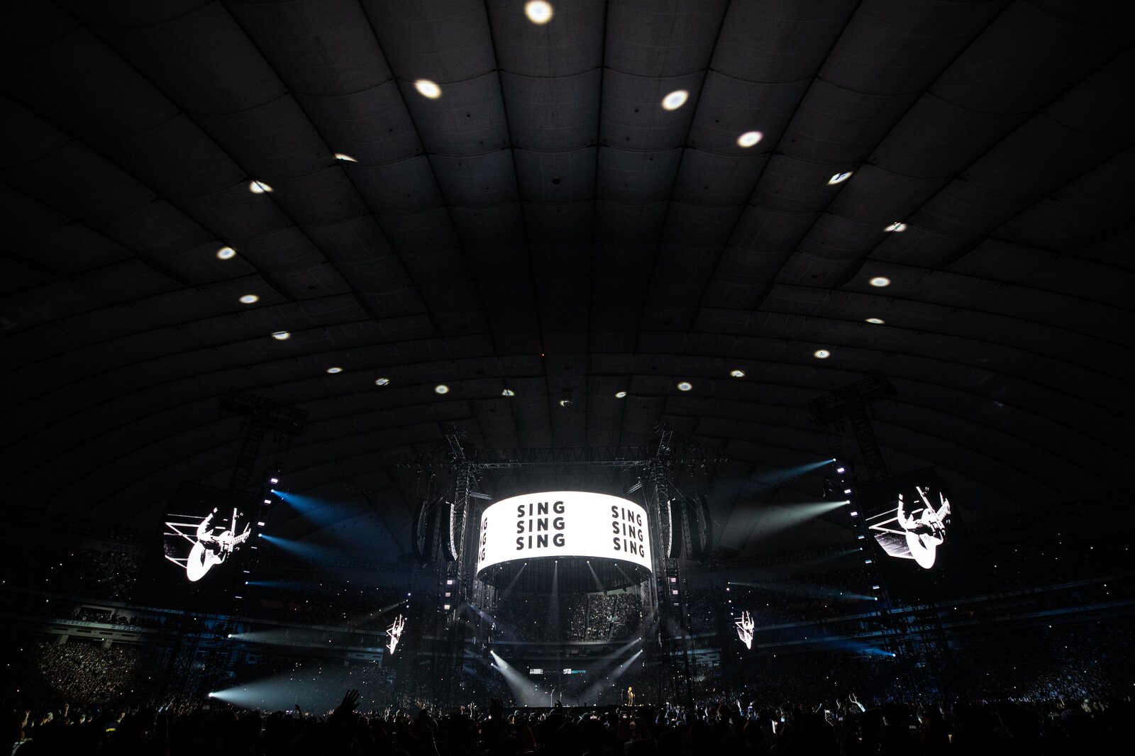 2年前に大切な友人を突然亡くしたショックから書いた曲という「Eyed Closed」に続く「Give Me Love」は、エドのソングライティングの才能を世に知らしめた初期の名曲だ。この曲も最初は会場に広がるライトの海に向けて語りかけるように歌われていたが、終盤に向けてギターの音や自身の声を重ねていき、最後はマイクを手に声を上げ、会場からの声を促し、東京ドーム全体をエドのコーラスの渦に巻き込んでいく。コーラスの渦は感情の波動となって観客を熱く揺さぶり、エドが激しく声を張り上げれば、その波動も会場を大きく揺らす。最後にはエドが指揮者となって会場からもウォウウォウと声の波が起こり、それがまたエドがステージを走り回ると同時に渦巻いていく。最後はハーモニーだけで静かに終わり、感涙しそうになった。芸術的なヴァージョンアップを体感することができた。エドはパフォーマーとしての才能もとてつもない。