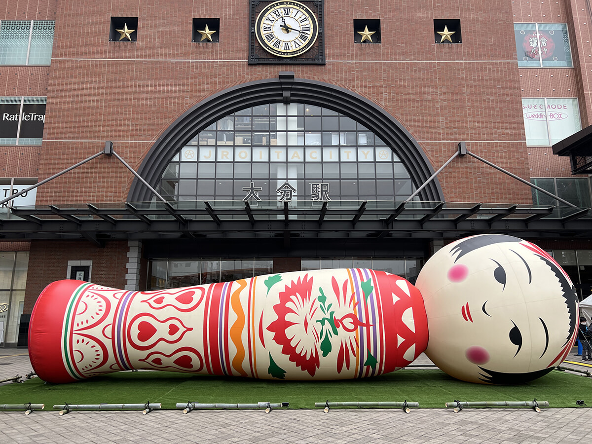 見どころ1. Yottaの巨大こけしバルーン『花子』が大分駅前に出現!