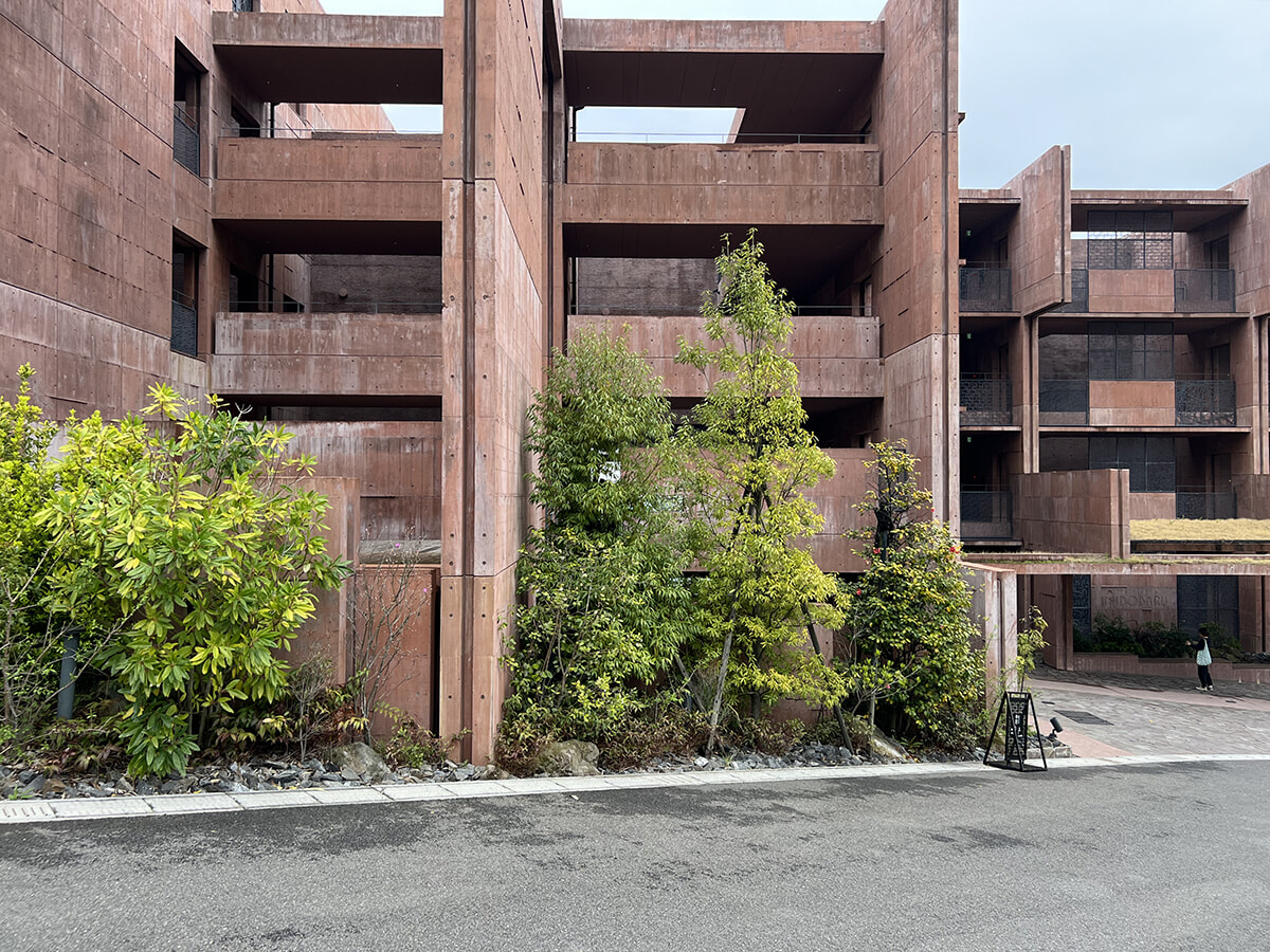 数多くある別府の温泉宿のなかでも、アートに囲まれた空間で宿泊を体験できるのが、2020年にオープンしたGALLERIA MIDOBARU(ガレリア御堂原)。堀田温泉に位置するガレリア御堂原は、路地の多い別府の町を模した立体的な建築構造で、柔らかい土の感触を伝えるような赤茶色の外観が特徴。