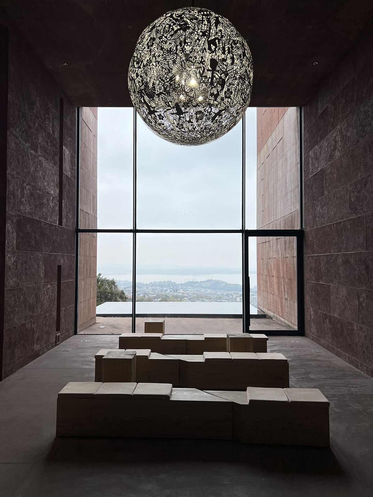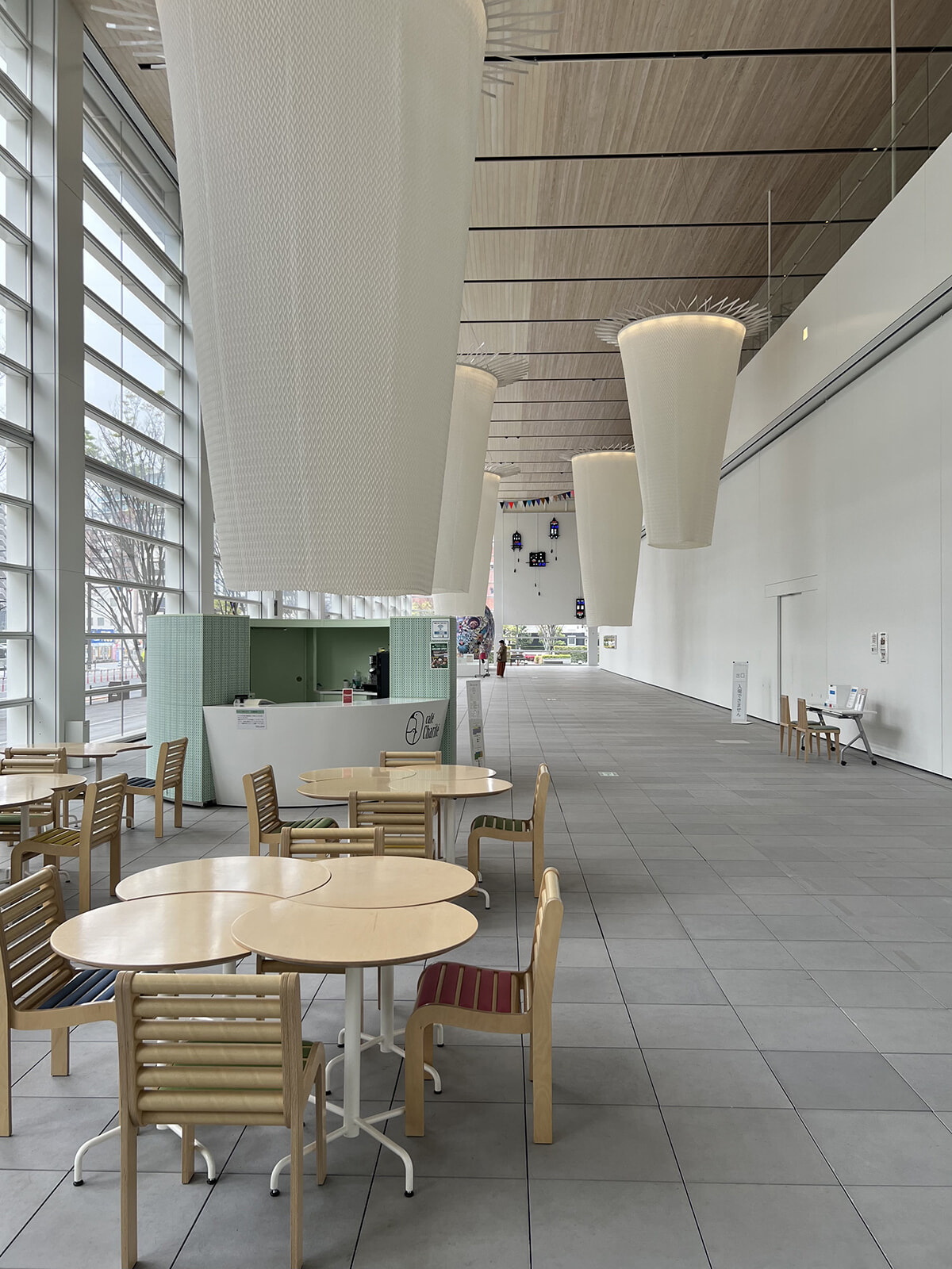 大分県立美術館(OPAM)1階アトリウム。ガラス張りの開放的な空間が心地良い。手前のカフェスペースの向こうには須藤玲子の『水分峠の水車』が展示されている。