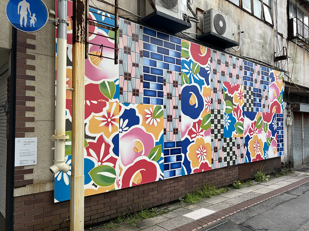 路地を華やかに演出する、マイケル・リンの『温泉花束』(井上デンキセンター新宮通り側壁)。別府で見つけた浴衣やタイルに着想を得た11種類のポスターの模様から構成されている。