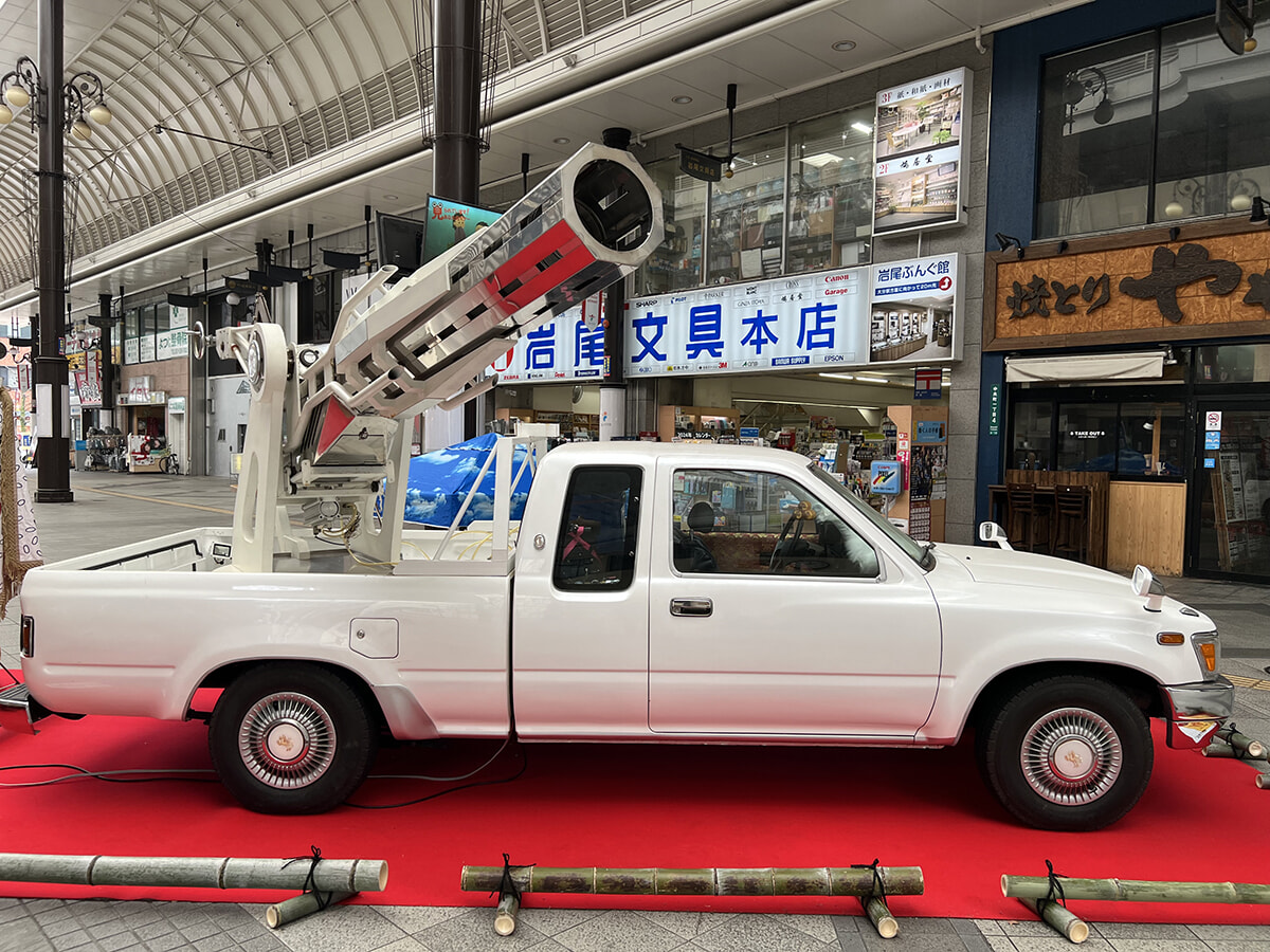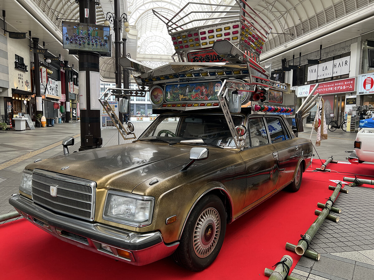 大分の中心市街地へと歩いていくと、アーケード商店街のガレリア竹町ドーム広場にはYottaによるレトロな車を用いた作品、『金時』と『穀』(たなつ)がお目見え。トヨタ・センチュリーに派手な装飾を積載した『金時』は単なる改造車ではなく、石焼き芋車というから驚き。トランクの焼き釜で薪を使って、実際に芋を焼き上げることができる。