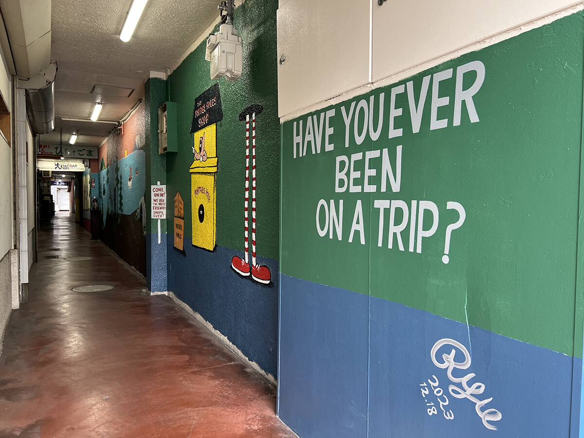 思わず見落としてしまうような細い通路に設置されたアート作品、Ryu Ambeの『HAVE YOU EVER BEEN ON A TRIP?』(大分市中心部にある奥の細道ビル通路壁面)「おおいたストリートアートMAP」を手にしながら作品を見て回りたい。