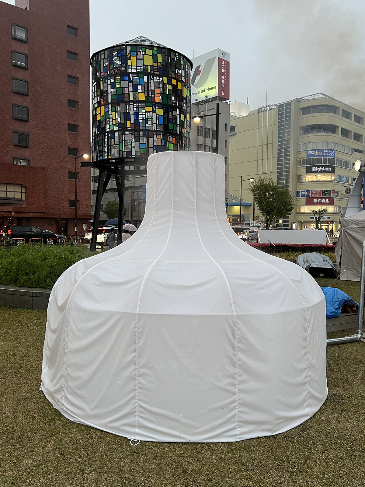 白い『穀』は米に圧力をかけて作る「ポン菓子」の製造・販売車だ。大砲のような機械でポン菓子を作ることができ、突発的にデモンストレーションも実施される。このほかYottaは『くじらのカーニバル』や『青空カラオケ』などの作品を中心市街地各所に設置するだけでなく、府内五番街に設けたアトリエにて公開制作も行う。”鬼の存在”に着目して制作を続けるYottaは、国東半島に鬼の伝説が残ることに興味を抱き、自然がダイナミックで人々の熱量を感じる大分の地がとてもおもしろいと言う。