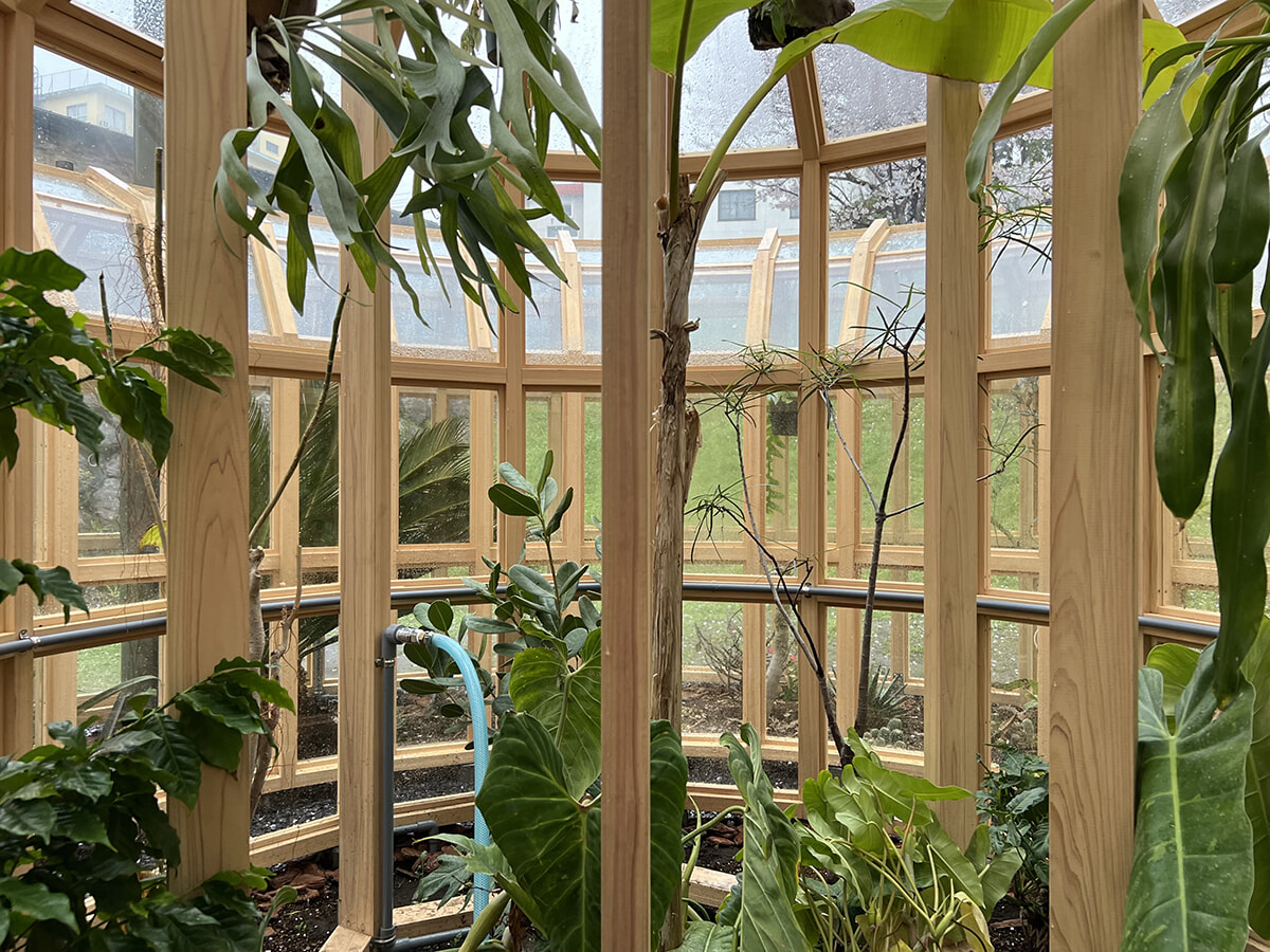 『植物元気炉』の内部(プレスツアー時に特別に公開)。日当たりや湿った環境などを考慮しながら、ゴムやガジュマルなどの植物が植えられている。いまは温める機能はないが、今後は追加する可能性もあるとのこと。