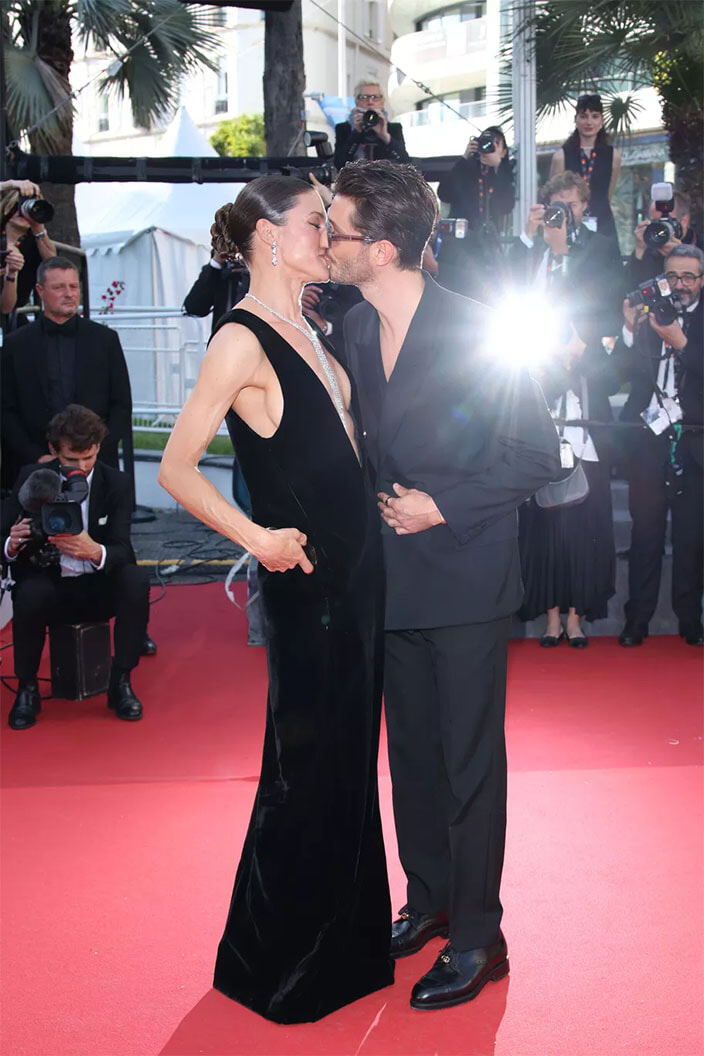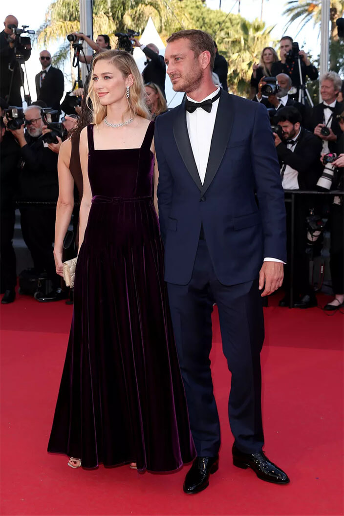 Netflixのドラマシリーズ「なんたるフィアスコ?!」にも出演しているピエール・ニネは、パレ・デ・フェスティバル周辺に集まったファンの歓声に応えながら登場した。しばしサインに応じた後、パートナーでありふたりの子どもの母親でもあるナターシャ・アンドリュースと合流し、今度は一緒に写真撮影タイム。仲良しカップルはフラッシュを浴びながら熱いキスを交わした。