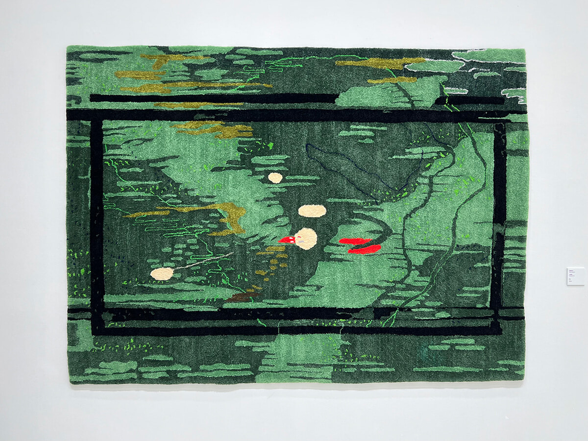 「野良になる」展示風景より、䑓原蓉子『大湊線』(2024年)。本展のための新作を描くにあたって、奥入瀬渓流や恐山、六ヶ所村などを訪ねた䑓原。目にした風景を鉛筆やiPadでドローイングにし、羊毛のテキスタイルへ変換して作品を生み出している。