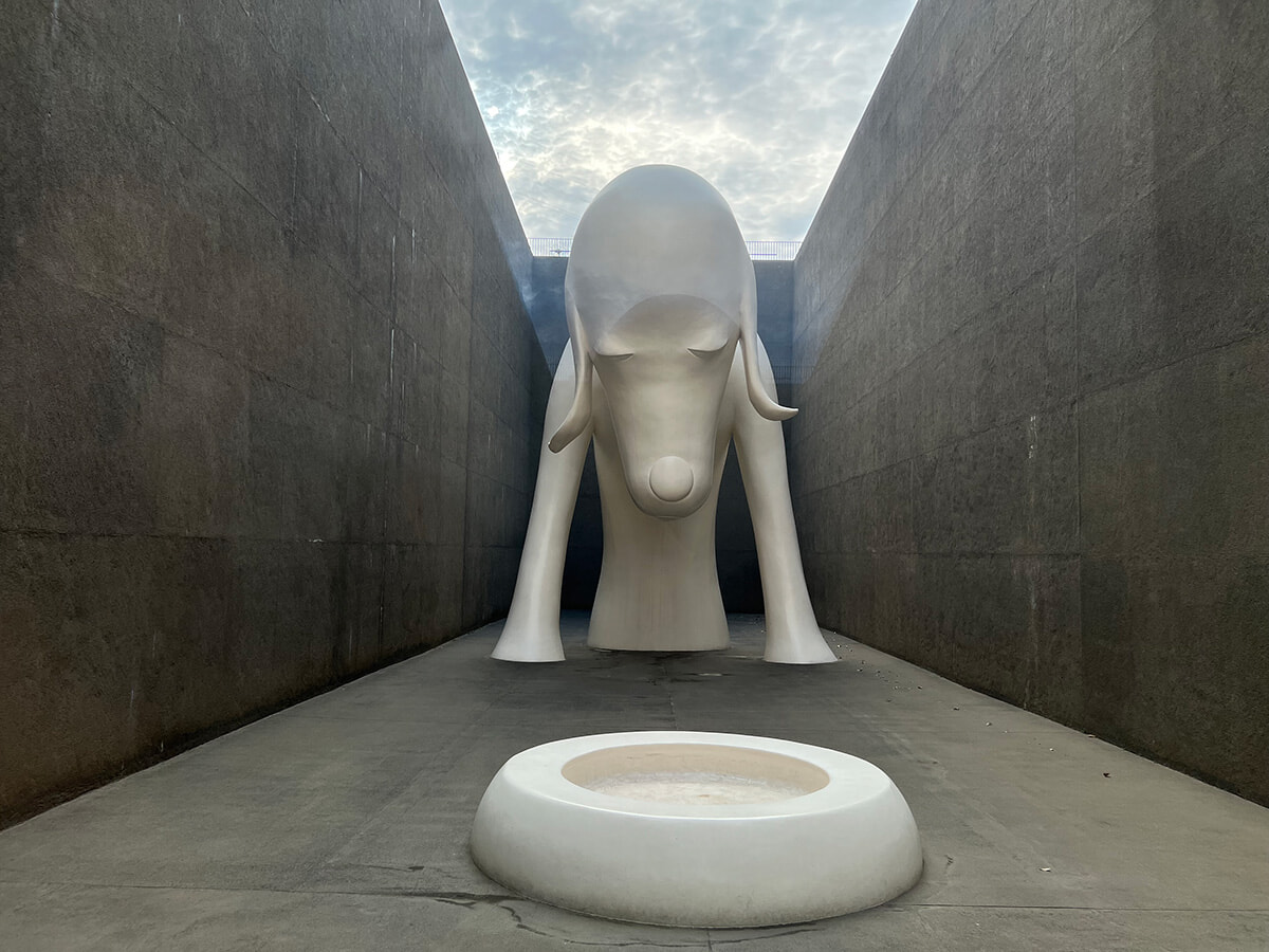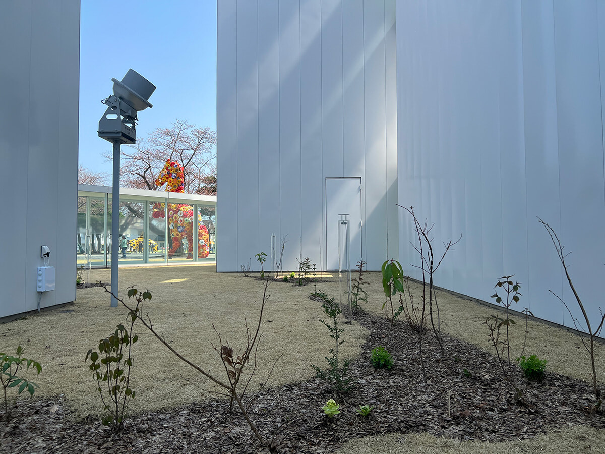西側の屋外スペースに立つ常設展示作品、奈良美智の『あおもり犬』(2005年)。2024年も4月23日から屋外連絡通路が開通(雪が降るまで)し、近くに寄って鑑賞できる。また南側トレンチに位置する「八角堂」の『Miss Forest/森の子』もお見逃しなく。